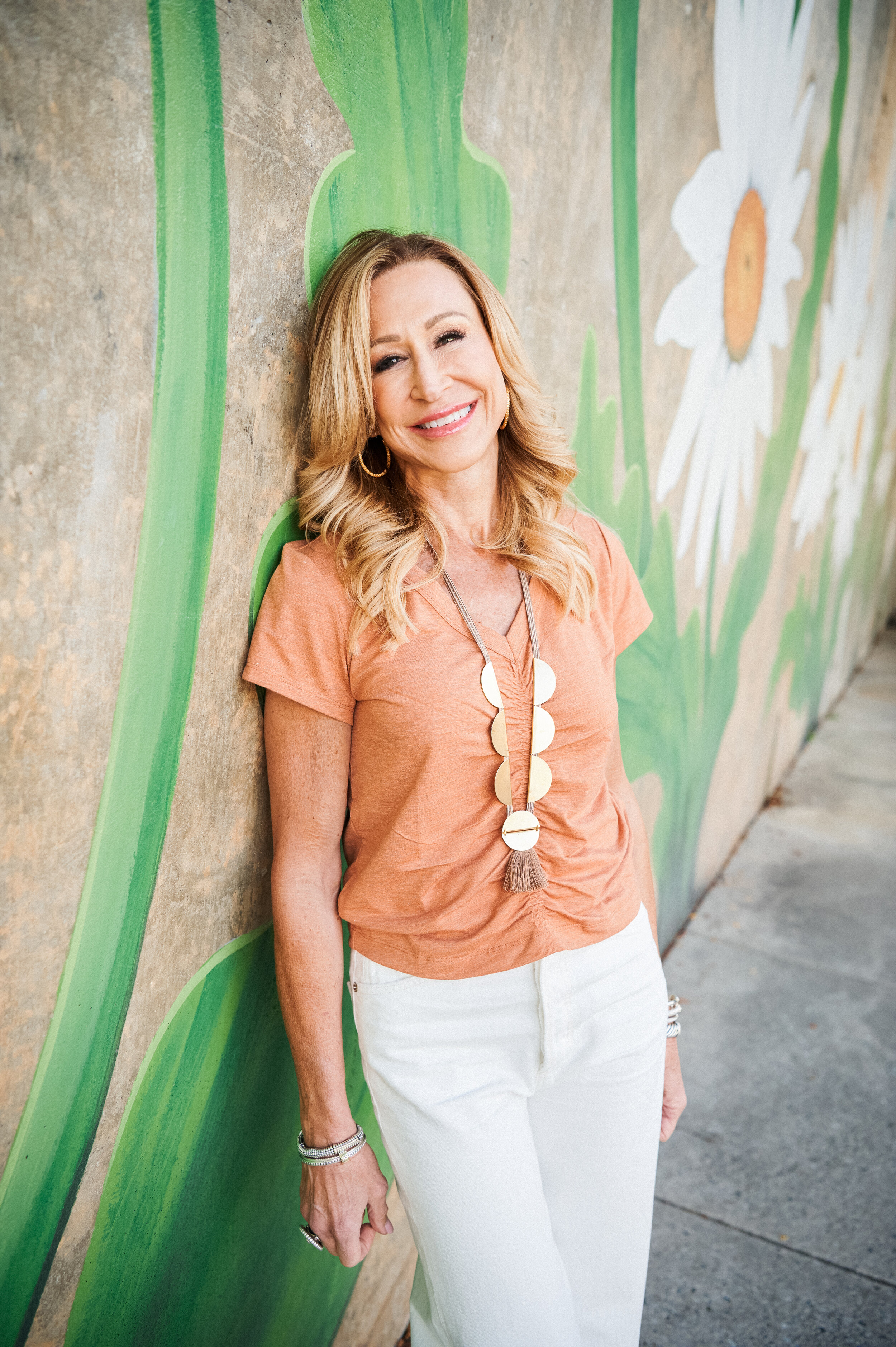 How much fun is this mural in Greensboro NC?! I jumped at the chance to have my picture made in front of it! My wide leg jeans paired with my favorite tee from Loft are dressed up with gold shoes and a statement necklace (similar linked). I know you’ve seen this straw bag a million times already, but it literally goes with everything and instantly adds a summer touch to your outfit!