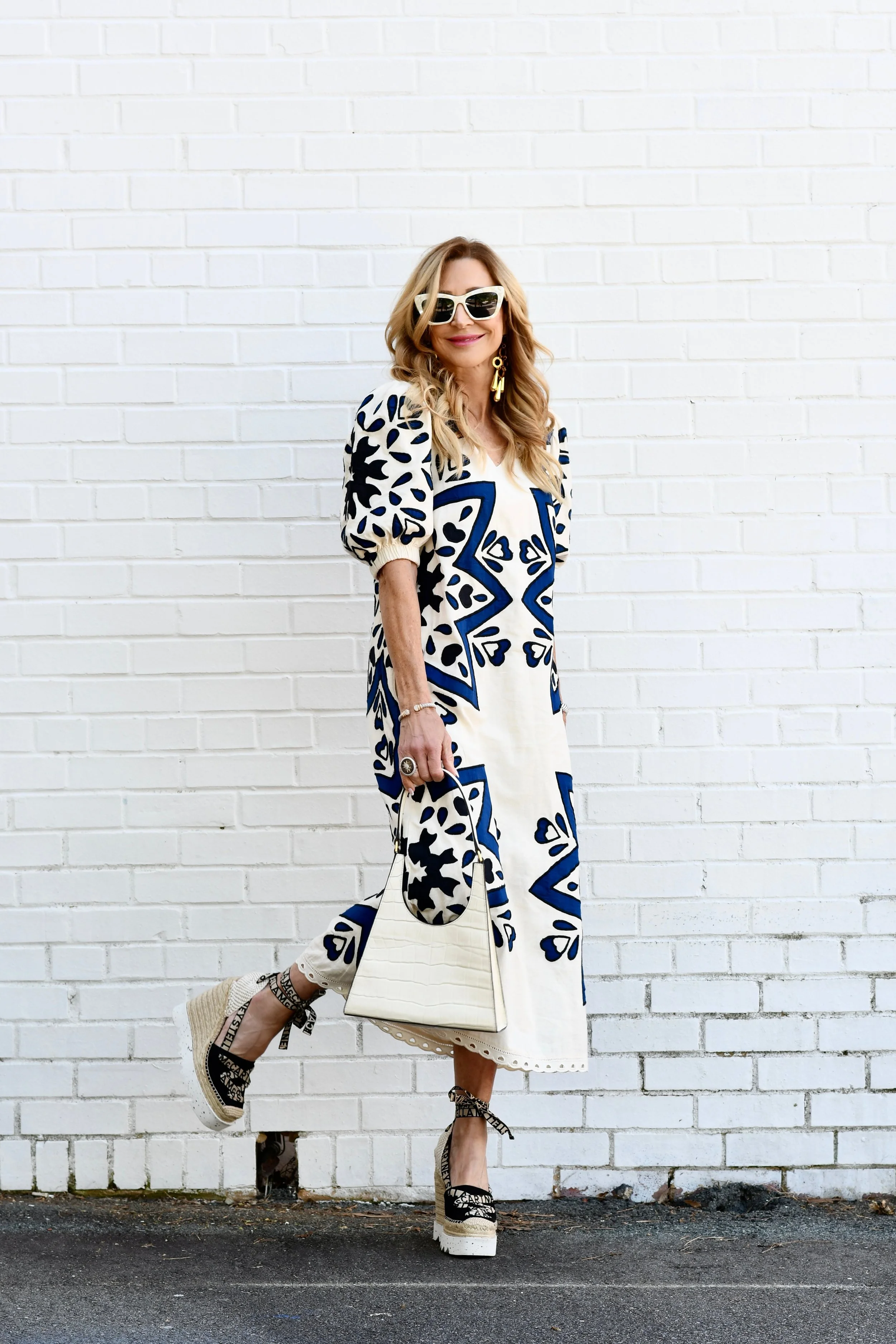 I purchased this gorgeous dress, also from Marie Oliver, to wear for Mother’s Day! I think it’s so feminine and the cutout on the side is very appropriate for lunch with my family! I wore huge earrings that I’ve had for years and added pink espadrilles. My cute bag is also an oldie but goodie from Poolside and I’ve linked a very similar one! I will also be styling this dress with flats and wearing it out to dinner at the beach…
