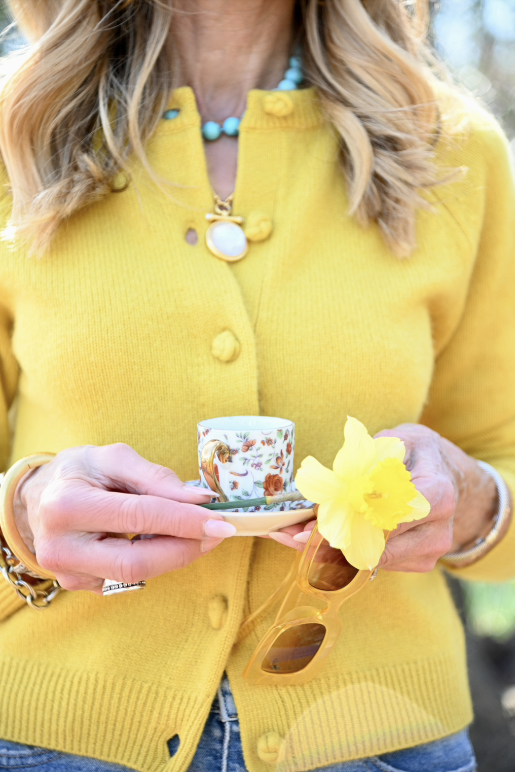 For jewelry, I layered a turquoise necklace that’s the perfect pop of color against the yellow, along with a beautiful mother of pearl piece from Julie Vos. And yes, I sat in the crook of our old red maple tree drinking from a demitasse cup that happened to match my sweater perfectly. Was it planned? Absolutely…and it was so much fun!