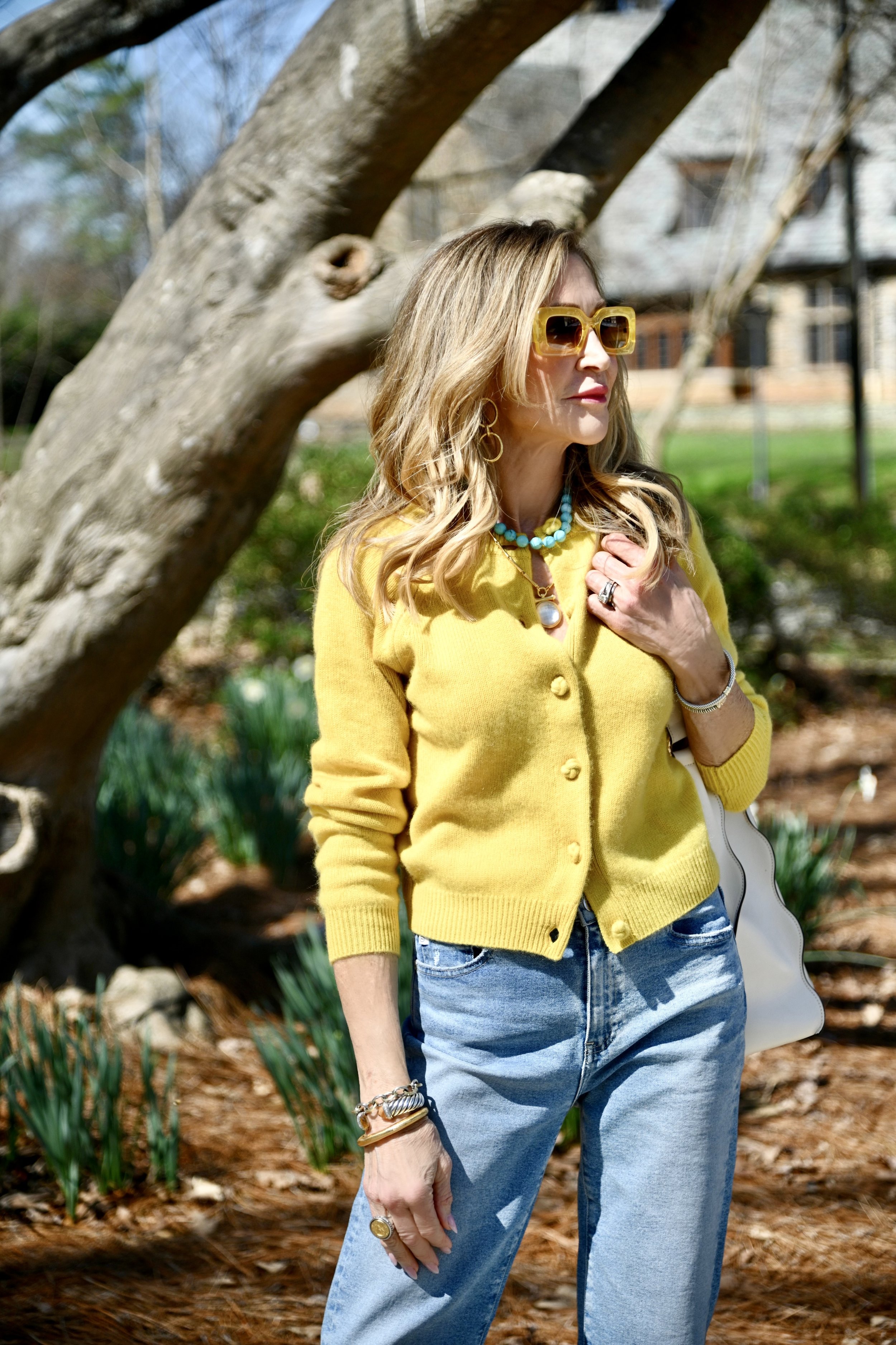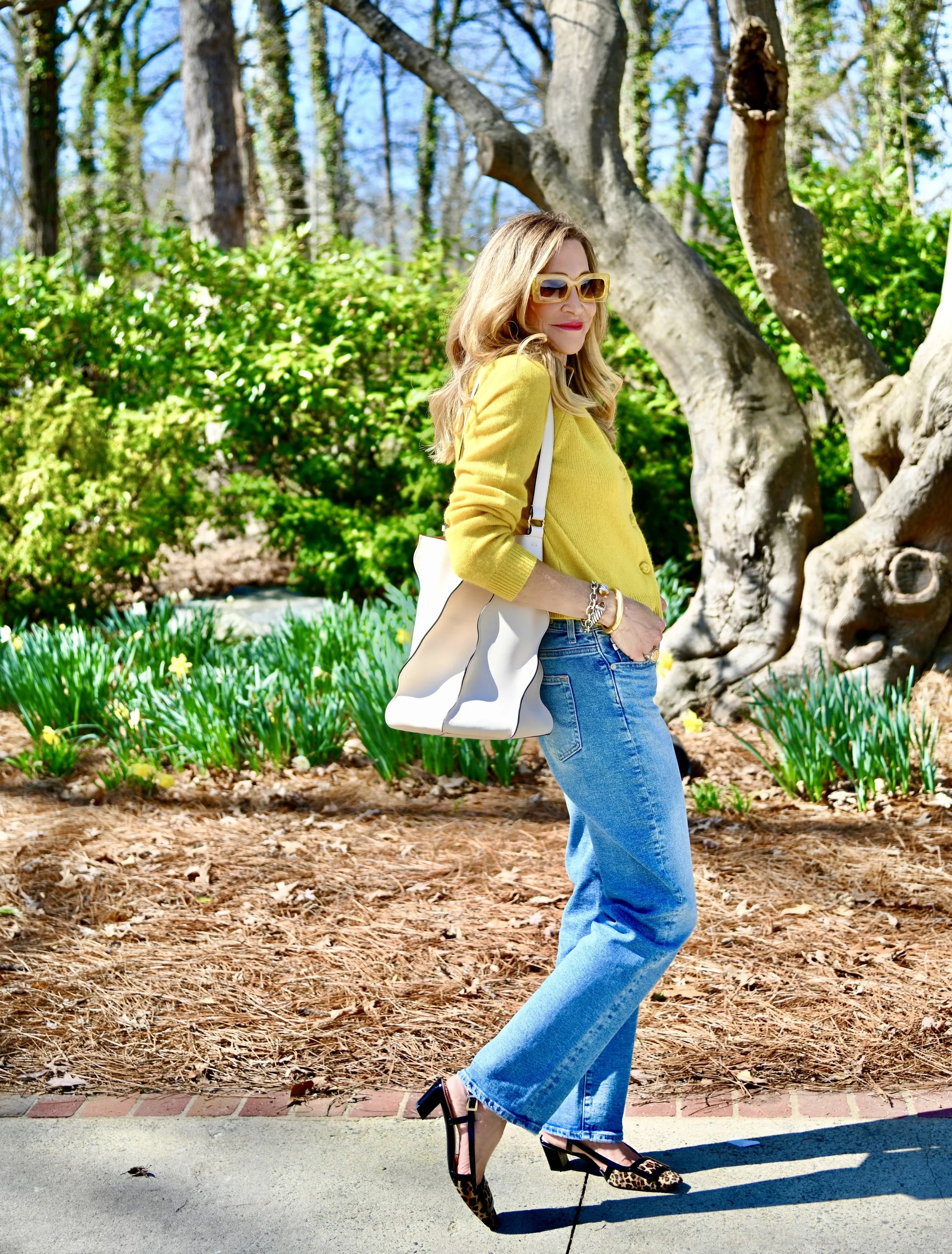 And…speaking of following the sun! I may have leaned into the theme just a little with this outfit. This buttery yellow cardigan from Tuckernuck is the exact color of sunshine, and wearing it felt like the mood. I paired it with my favorite AG boyfriend jeans that I reach for on repeat, and my Roger Vivier leopard pumps, because they added a bit of whimsy to the look. The yellow sunglasses are definitely obvious punctuation mark.