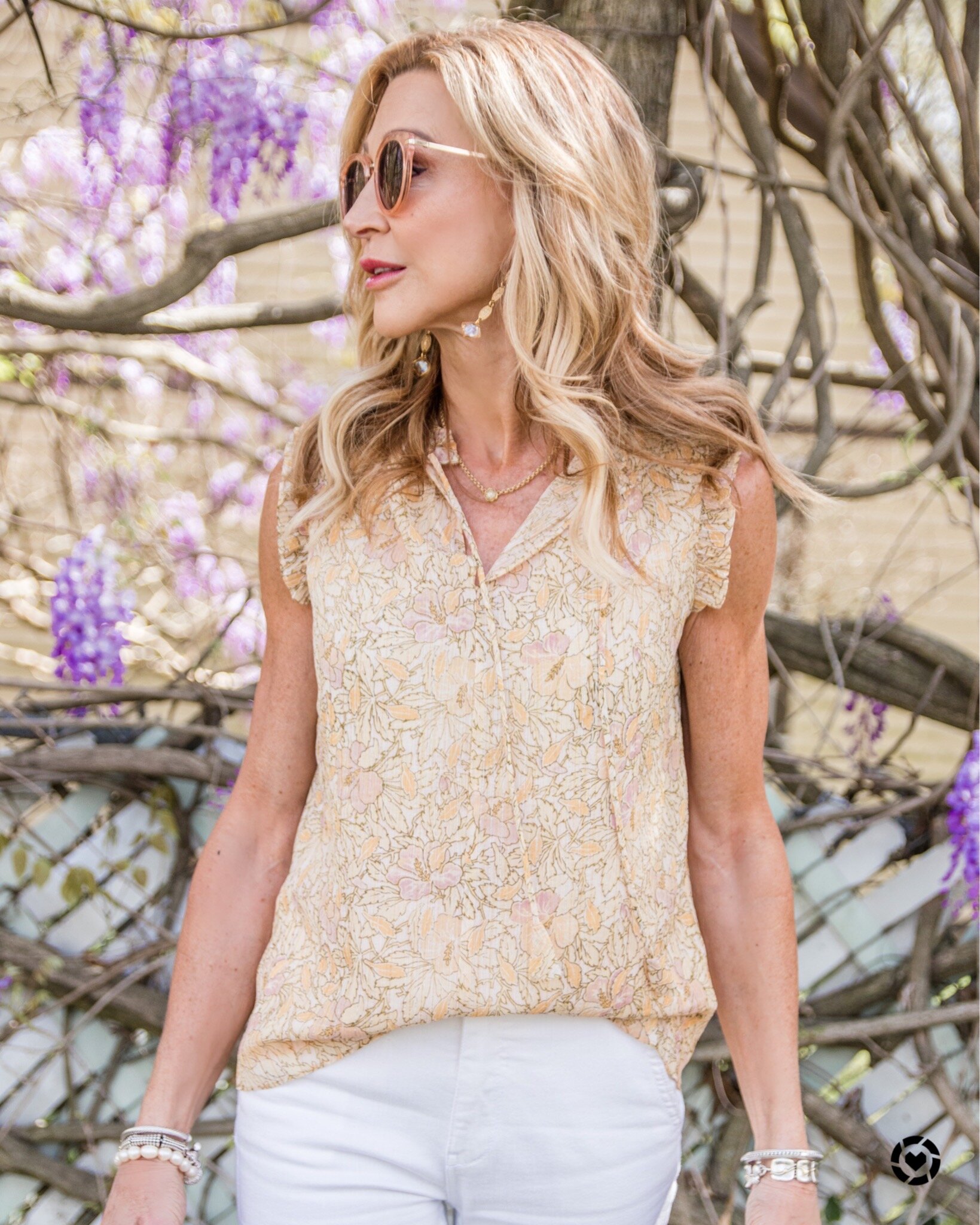 You all know my obsession with Ulla Johnson and the blouse Iβm wearing is one of my favorite tops. Iβm really looking forward to wearing it out to dinner very soon (hopefully)! Iβve paired it with white jeans from Citizens of Humanity and my favorite Gucci sandals!