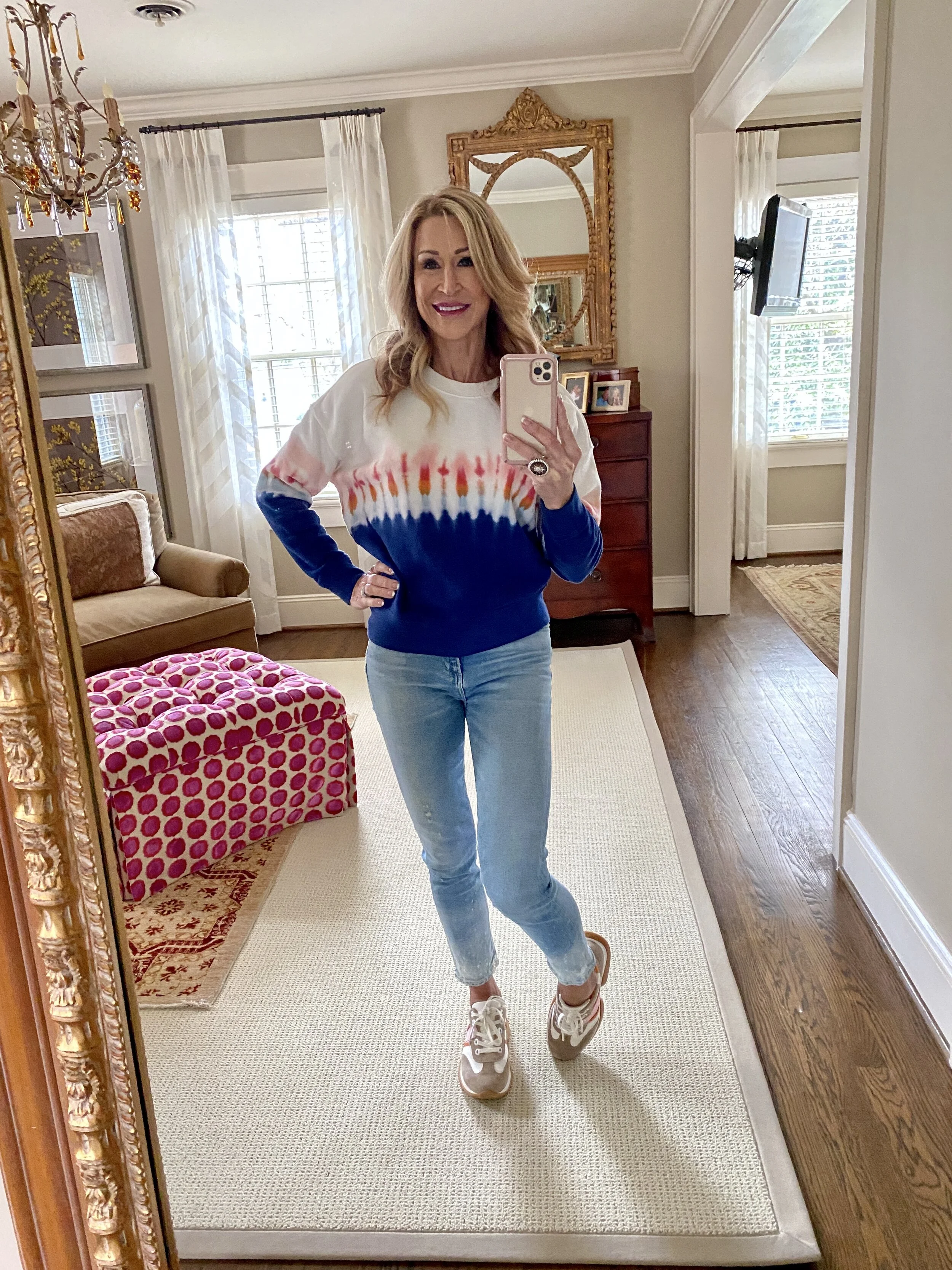 This is an outfit from my favorite local boutique, Rebecca & Companyβ¦be sure to check out their website because everything is 30% off right now and youβll find lots of great pieces for spring and summer. My sweater is from White + Warren and I love the crispness of blue and white so I paired it with white jeans and my Vince platform sneakers.