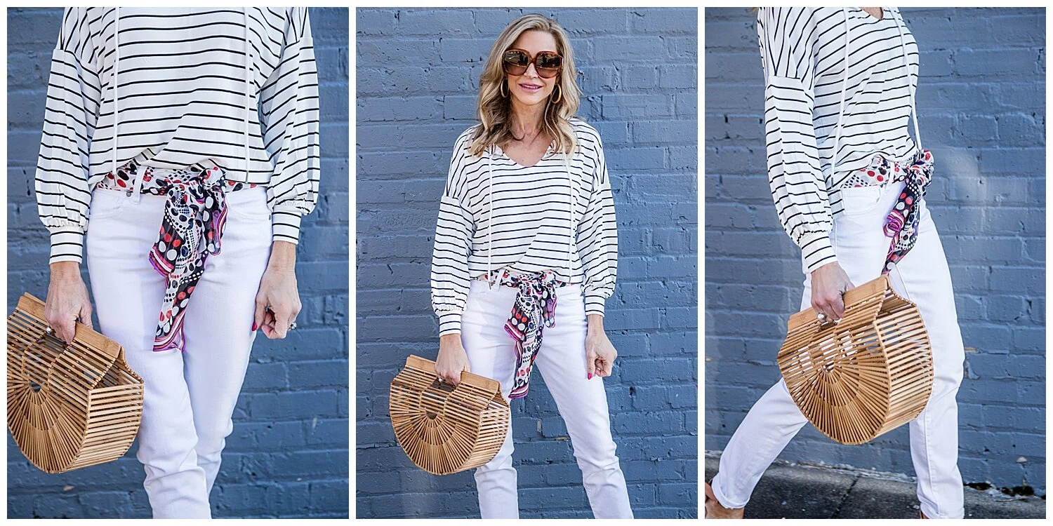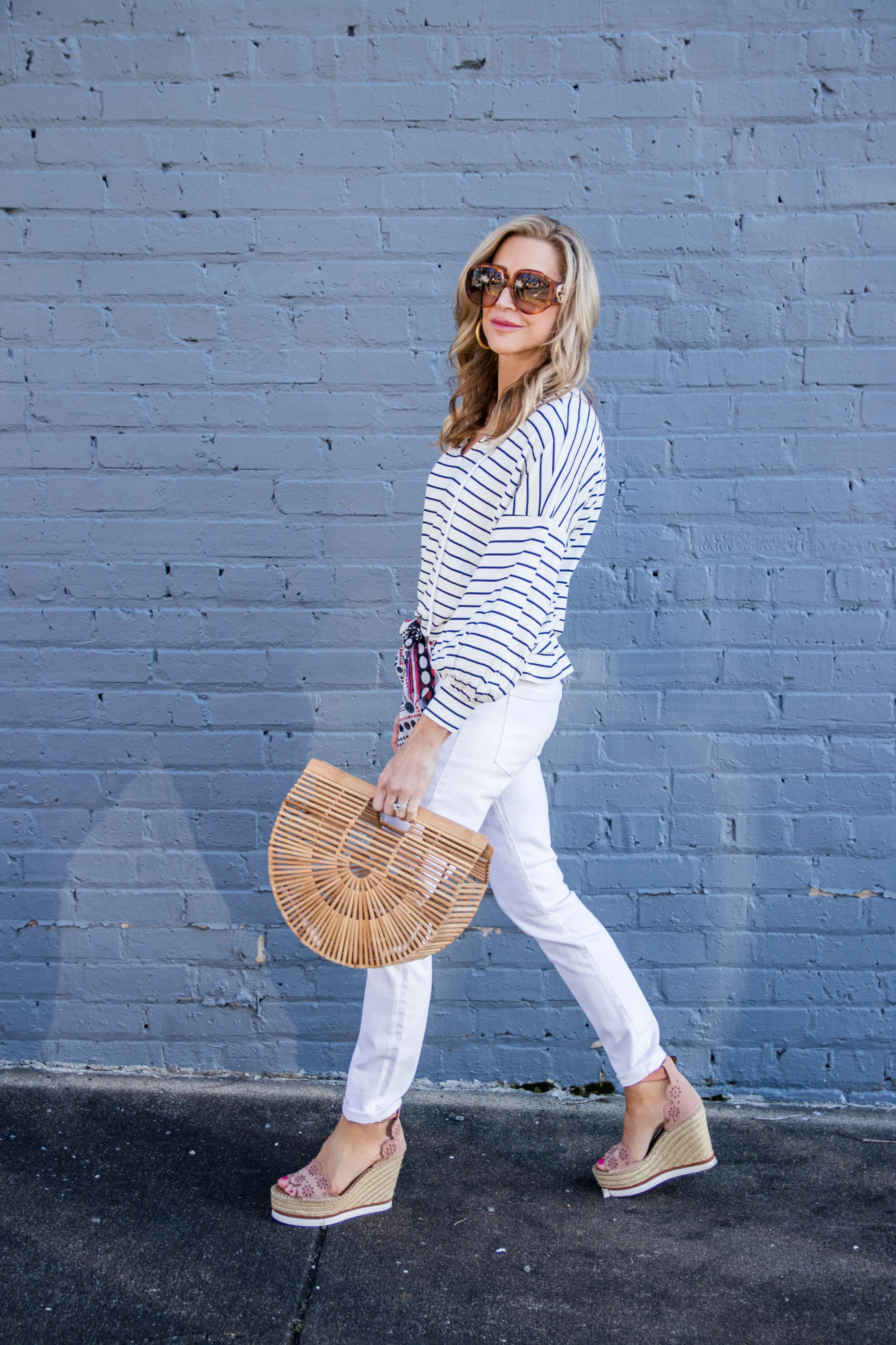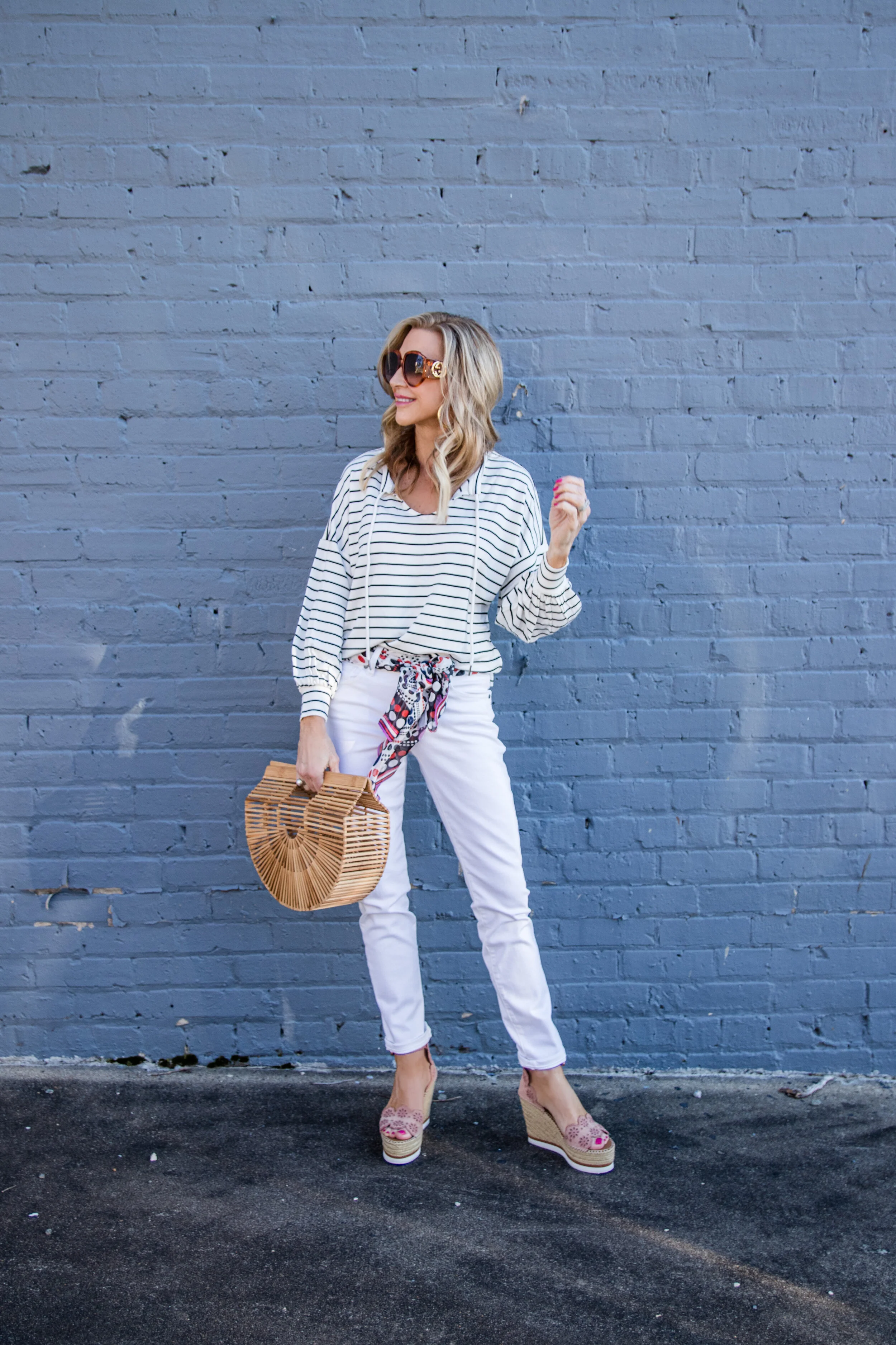 The first outfit combines the Relax Game Day Sweatshirt, the Shrimpton Scarf (worn as a belt) and the Cinch Skinny White Jeans. I added my Chloé espadrilles and Cult Gaia bag from last year (this one is fabulous too) along with my favorite Gucci sunglasses (similar here and also love these)! It think it’s a pretty cute outfit with a playful nautical feel!