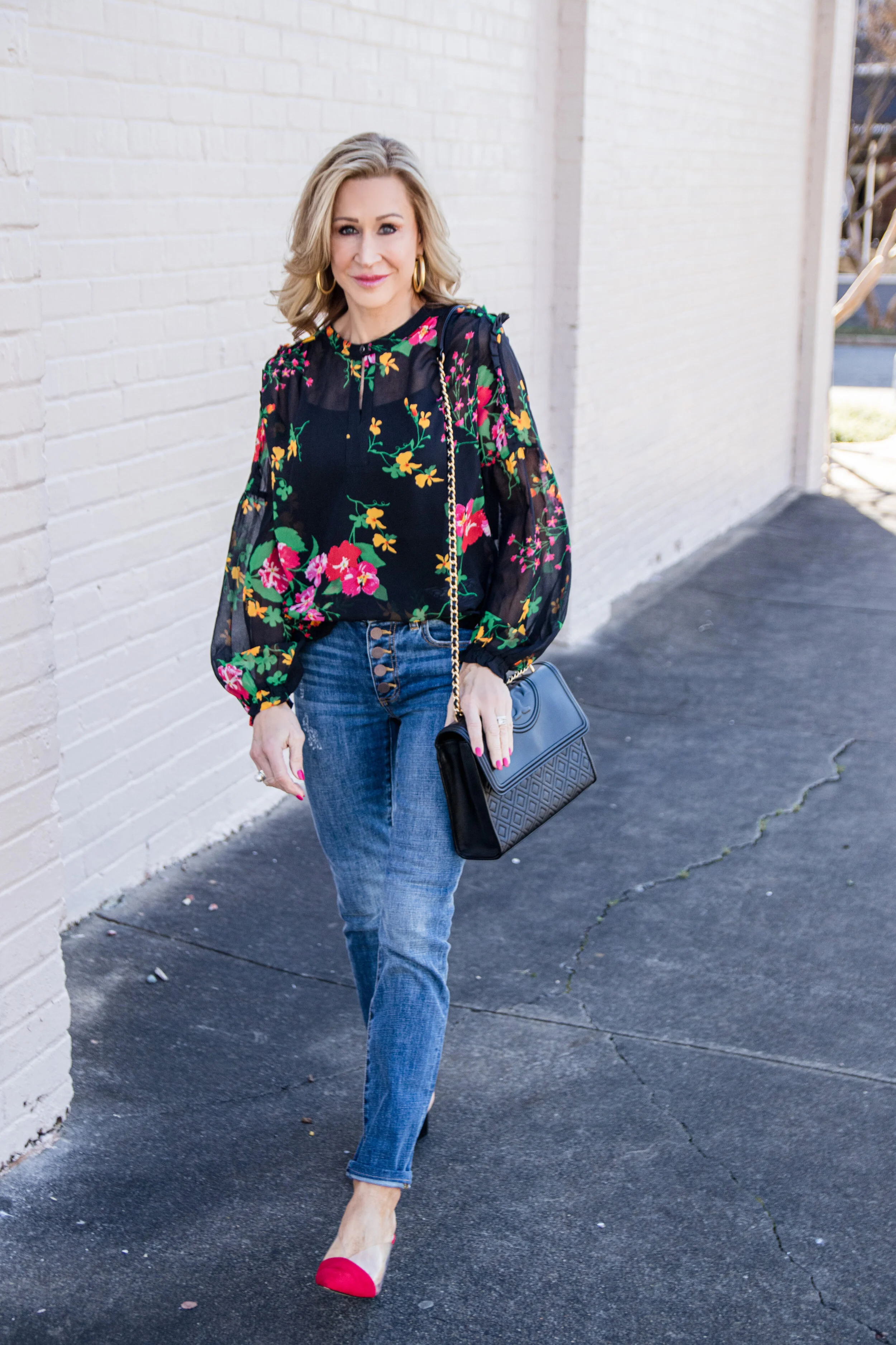 While florals for spring are hardly groundbreaking, they seem to be reinvented every year in new ways. This dreamy, romantic top with it’s bright floral pattern is great with jeans but could be tucked into most anything from dark flowy pants to the Drama Skirt (also from Cabi).