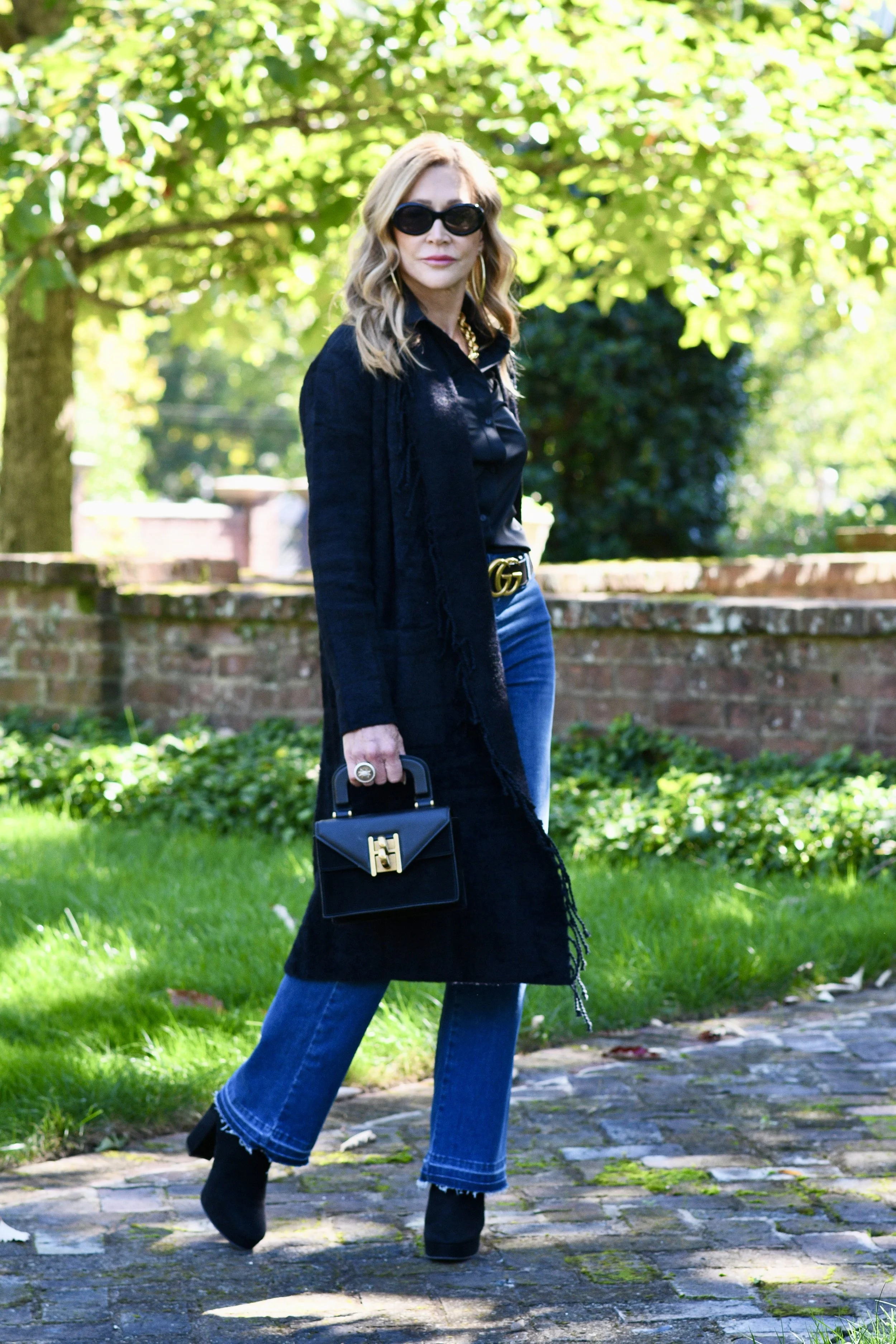 This whole outfit (with the exception of shoes and belt is from Lysse New York! The jeans are a pull on style with a straight leg and really comfortable. I love the fray hem and the medium wash. I am 5’4” so they are a great length on me…they have a 30” inseam. The black blouse is made from a luxurious wrinkle resistant fabric and has a little stretch. I added gold accessories (earrings and necklace) and my Gucci Belt and black suede booties from Stuart Weitzman (these booties are my favorite ever and I just bought another pair! These pieces are fabulous together but are also amazing and versatile separates!