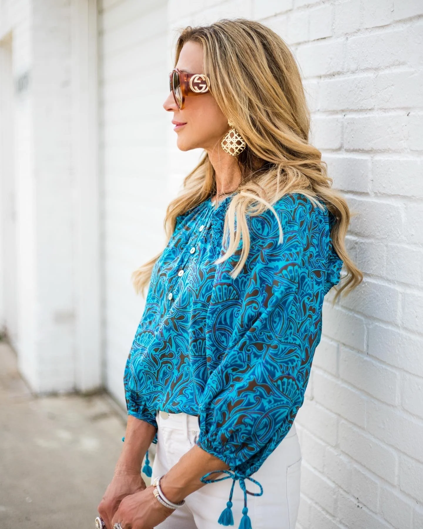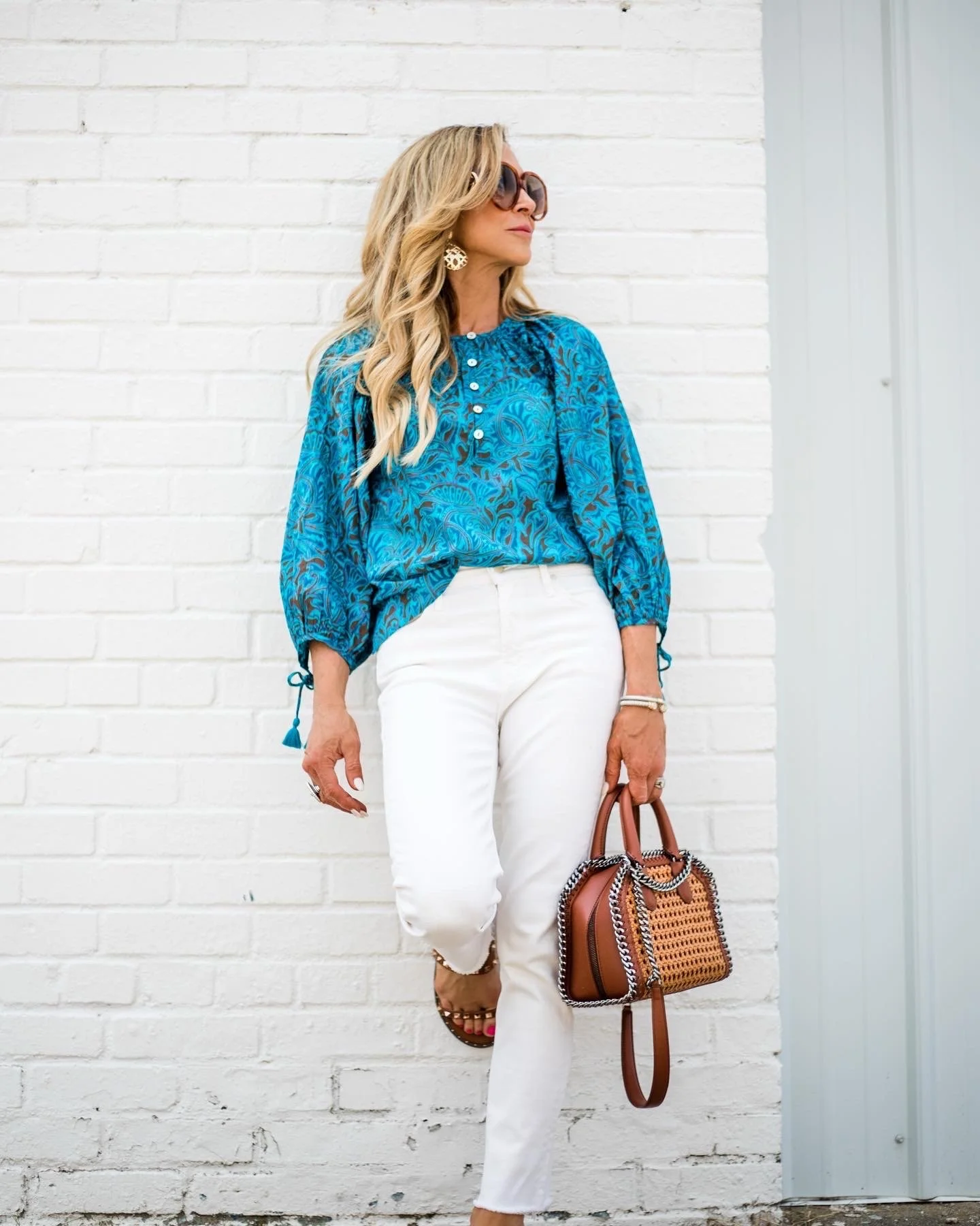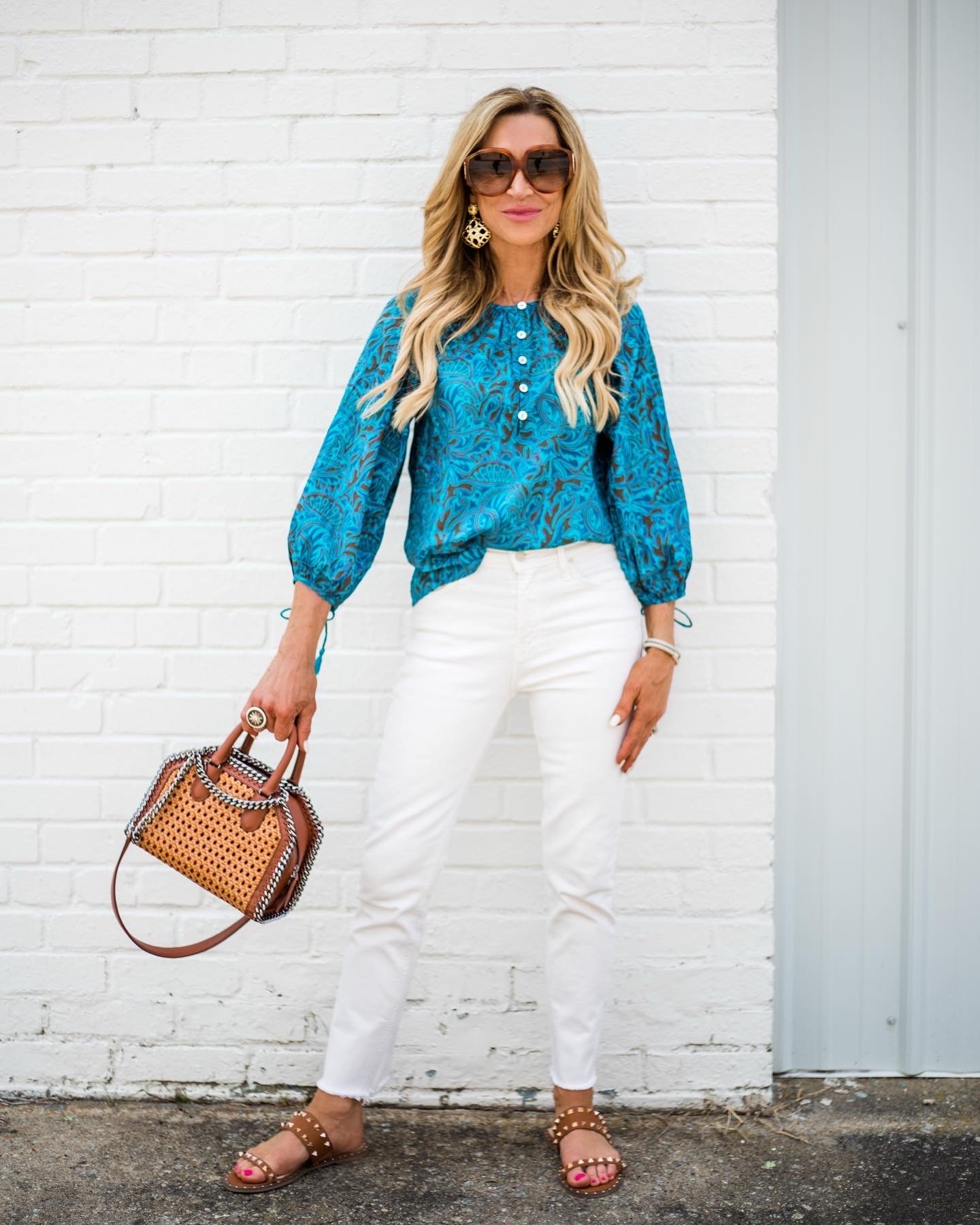 The outfit Iβm sharing today is one of my favorites! Iβm really loving this blouse from Cleobellaβ¦the color is perfect for spring and summer and great with white jeans, Paired with brown leather accessories, itβs a look Iβll wear all summer long and itβs definitely going in my suitcase to wear in Birmingham!