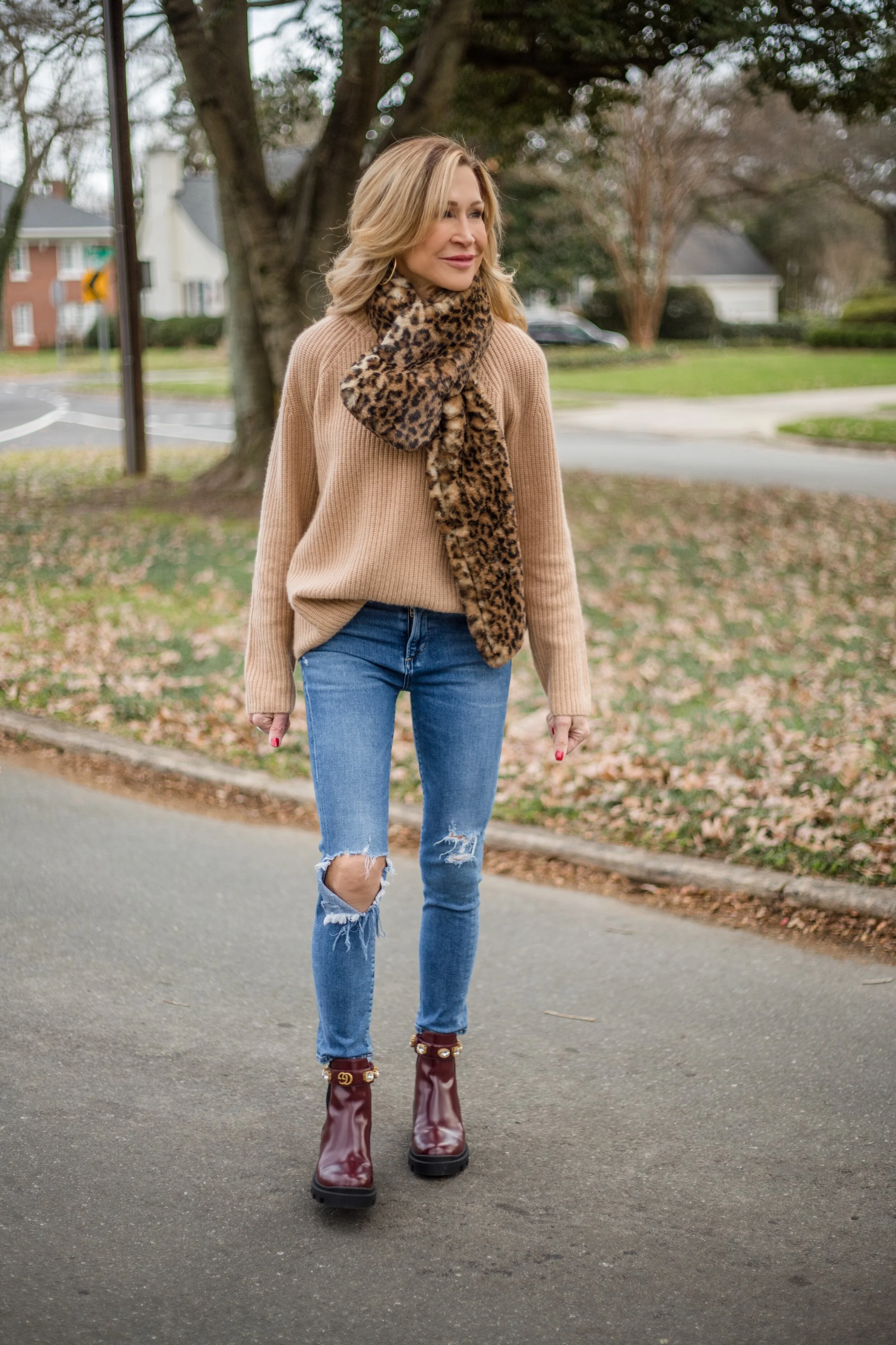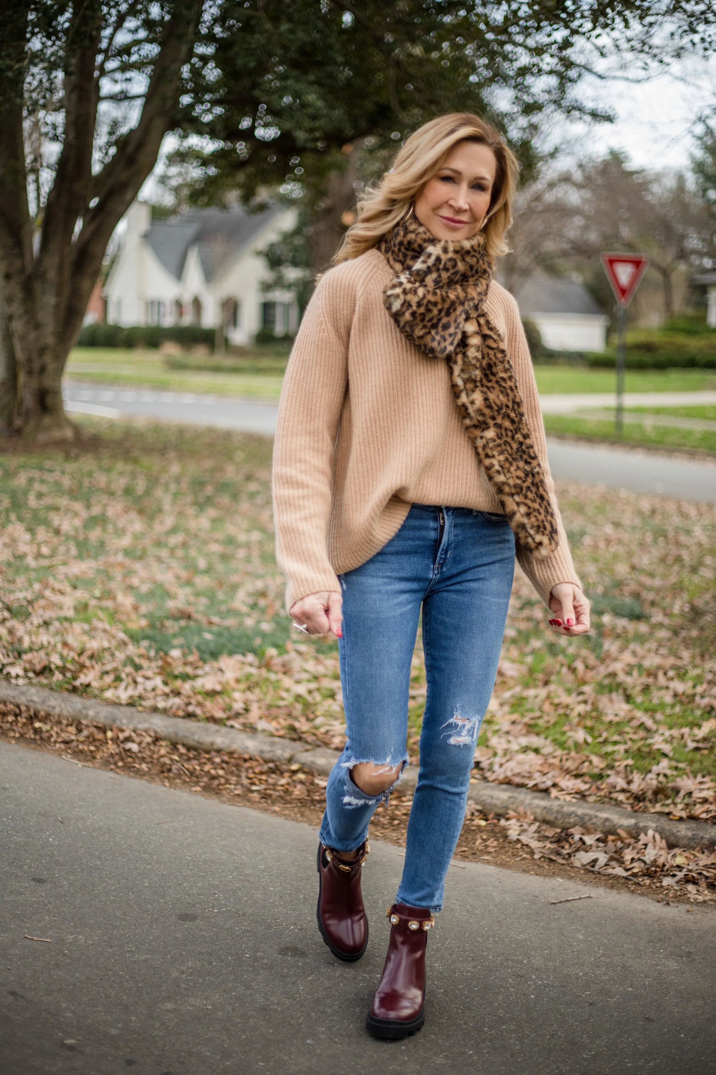 Iβm wearing one of my favorite pairs of jeans from 2 years ago. The rip just keeps getting bigger and the only problem with that as far as I can tell is the cold weather! Iβve paired them with fabulous embellished boots and a Vince sweater from last season. Vince is by far one of my favorite brands for great quality sweaters. They are not inexpensive, but they last forever and never go out of style! The cute scarf was sent to me by Cabi and I think it just makes the outfit! I would wear this anywhere and feel great!