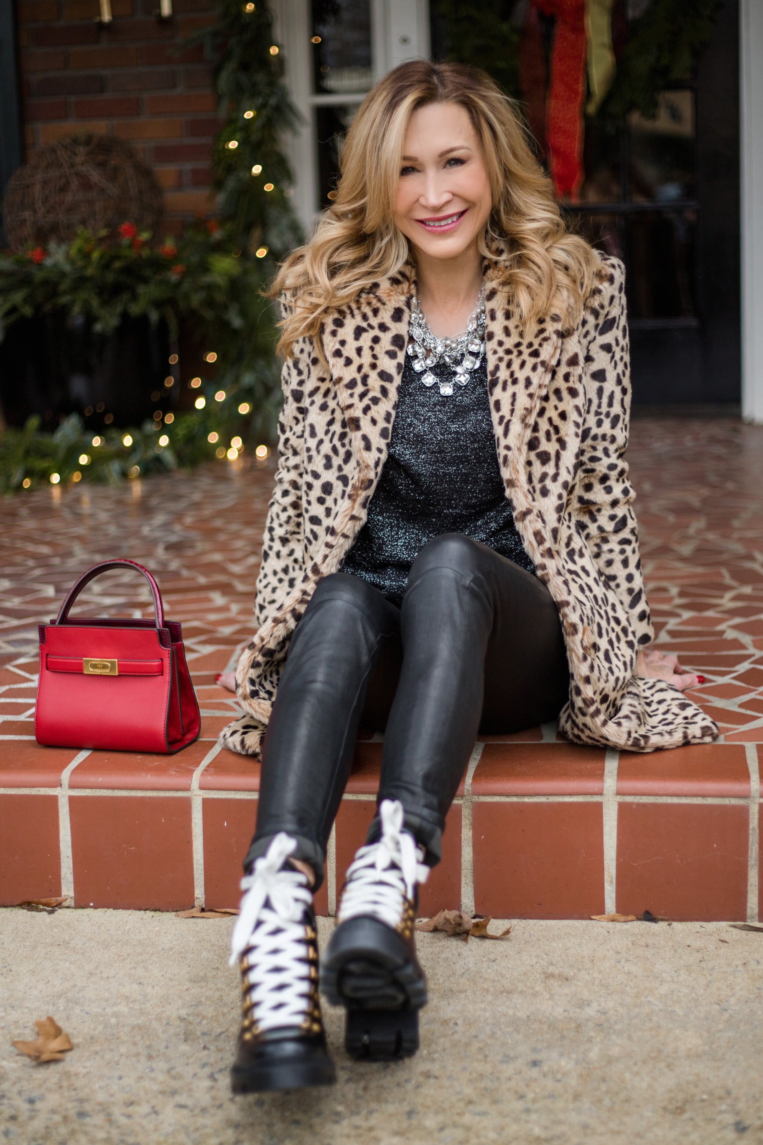 Iβve been looking for the perfect color of red handbag for a while now and Baldy gave me one by Tory Burch for Christmas! Itβs such a cute size and great for all year! When thinking about New Yearβs Eve at home, I decided to take a basic outfit and make it interesting with a little sparkle and some leopard. I would probably change out the sparkly sweater for a solid black one and change the necklace to something a little more understated for everyday. Other than thatβ¦I love this look. The black leather pants are on of my favorite purchases from 2020. The leopard coat is from Cabi and Iβve had the sweater for so long that I have not idea where I even got it. Itβs one of those pieces that Iβll pull out every year. AND you know I love my Gucci combat bootsβ¦