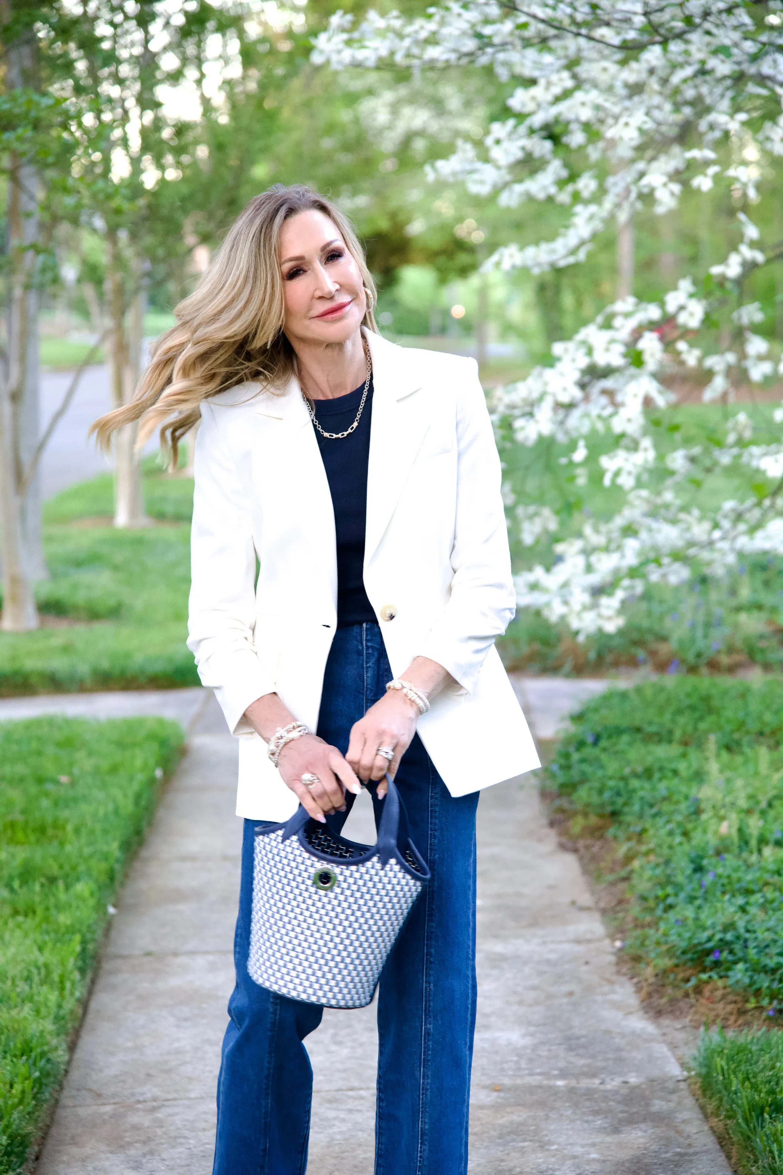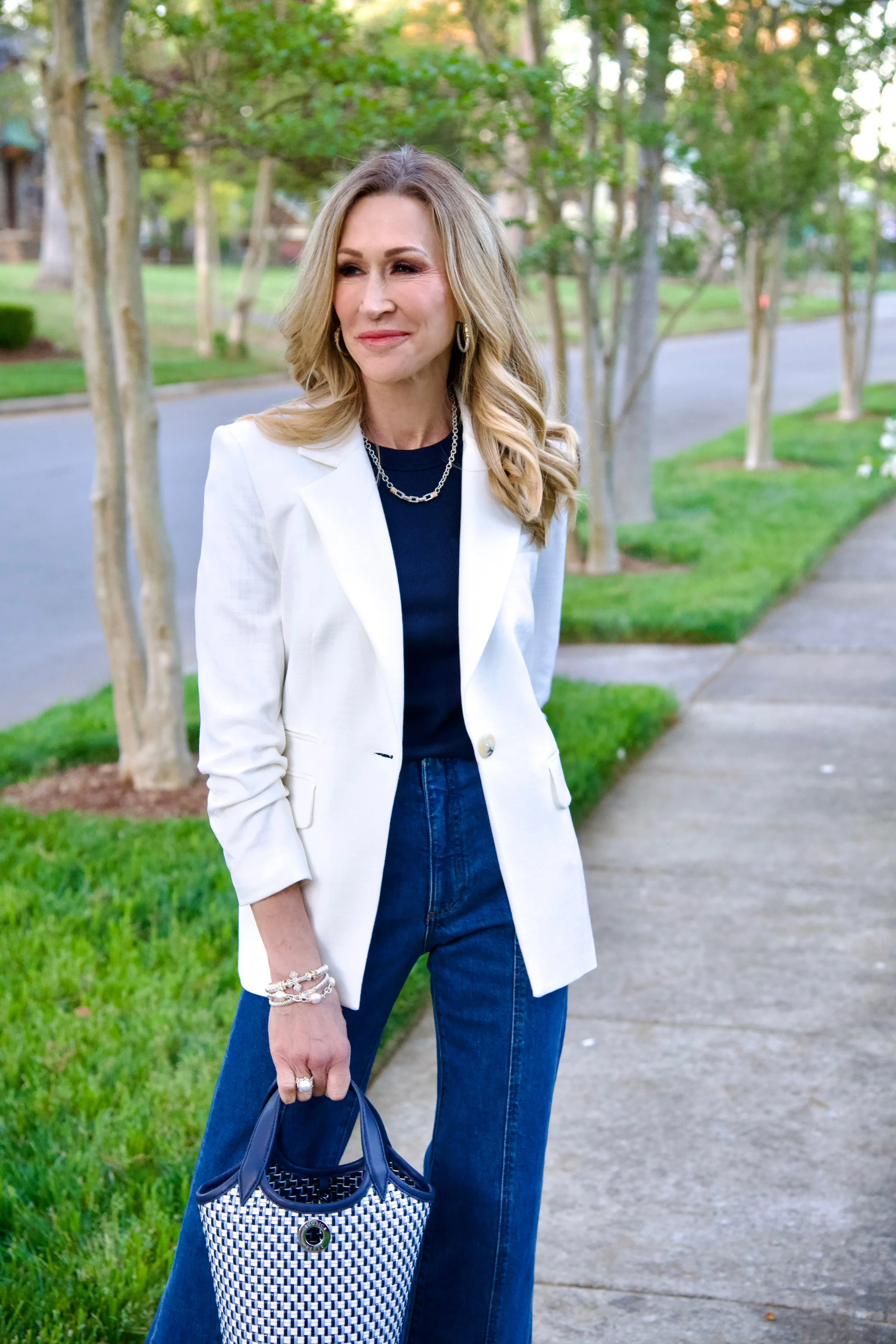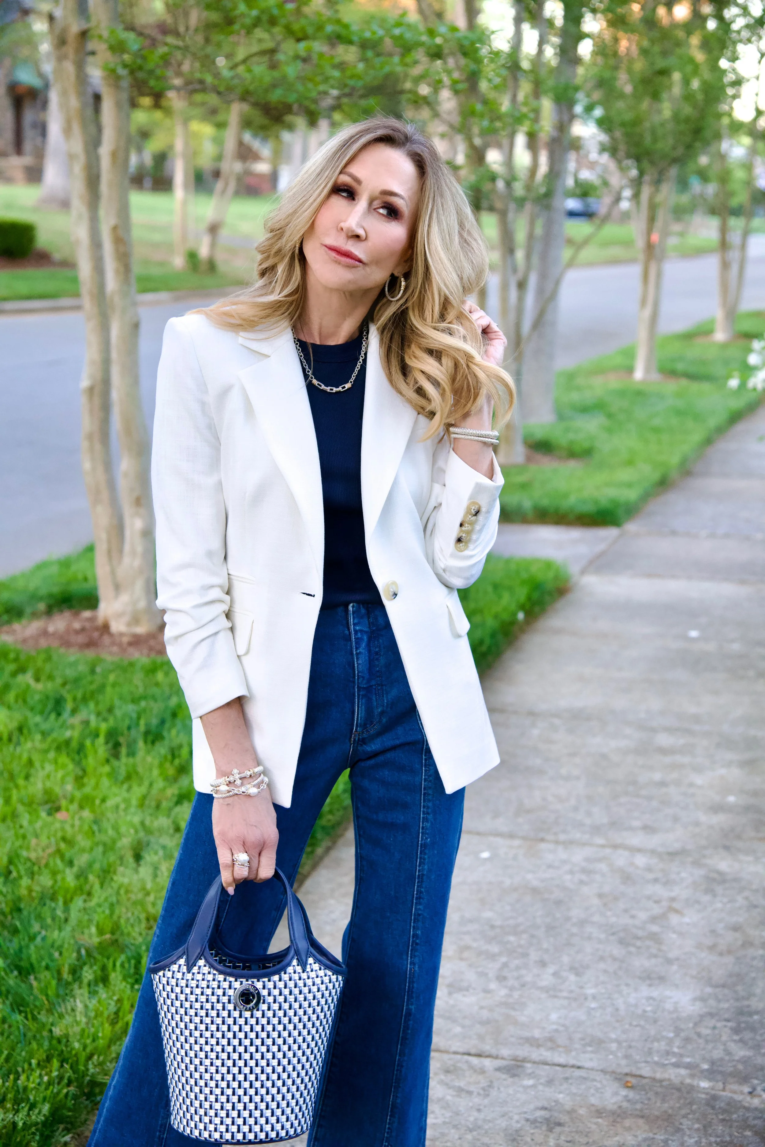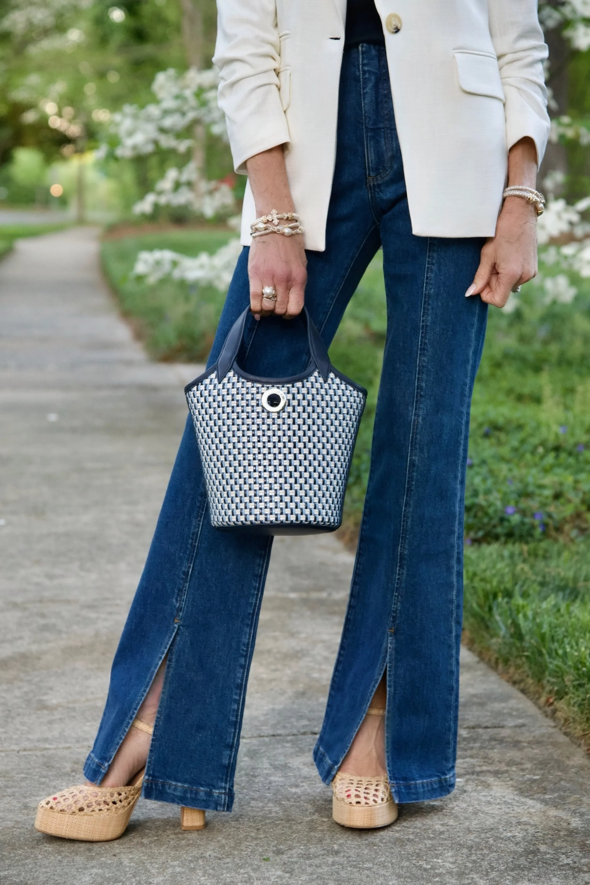 //Veronica Beard Blazer, Short Sleeve Tee and Bucket Bag//Paige Split Hem Jeans//Steve Madden Raffia Sandals//