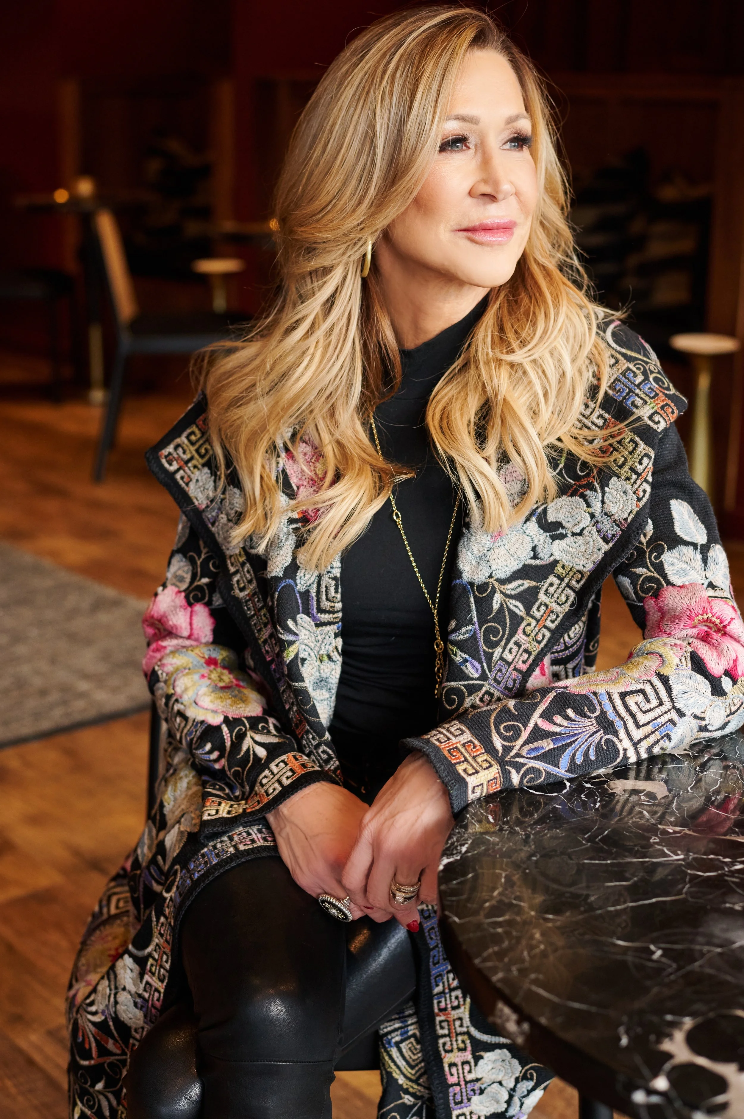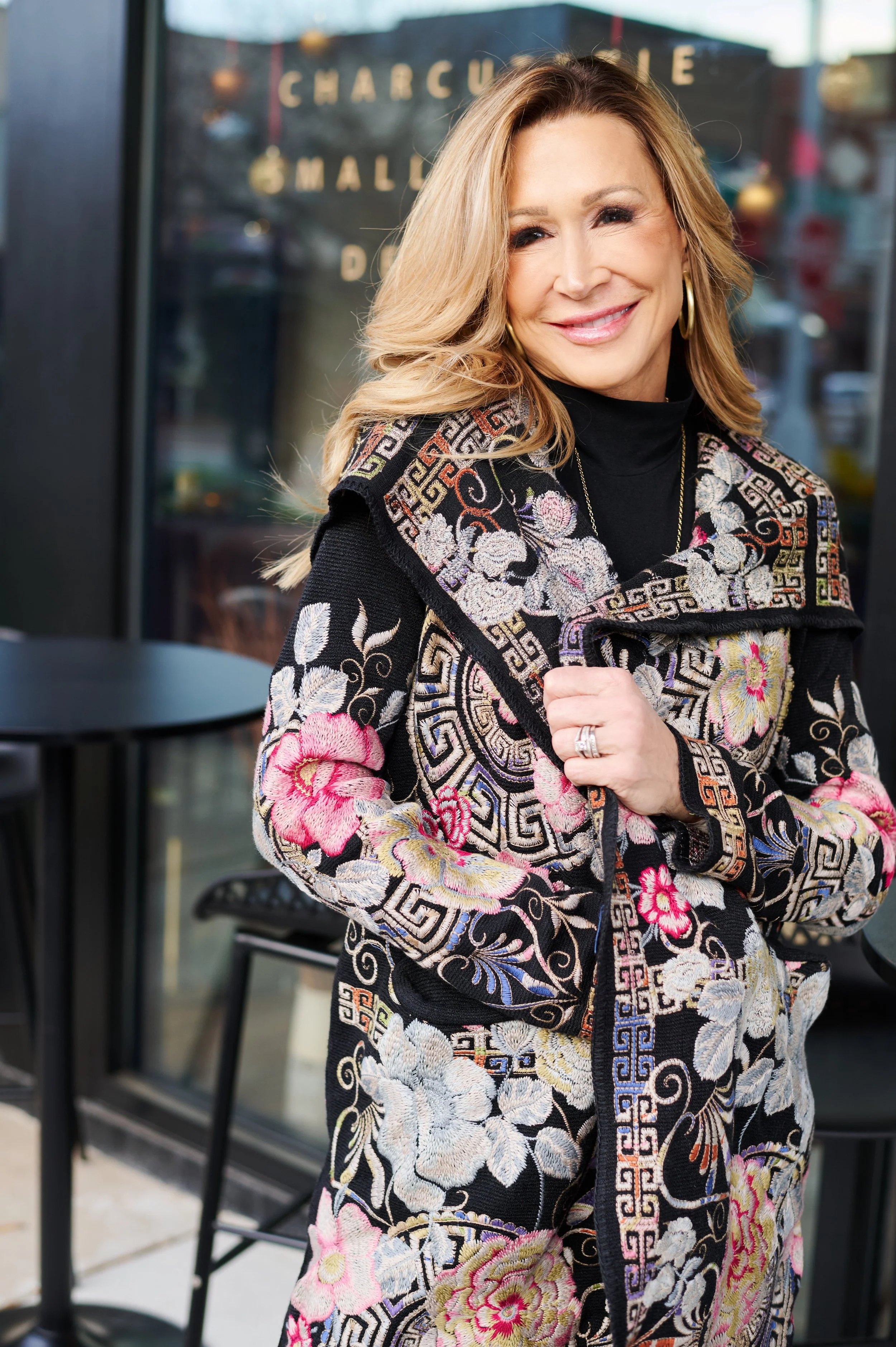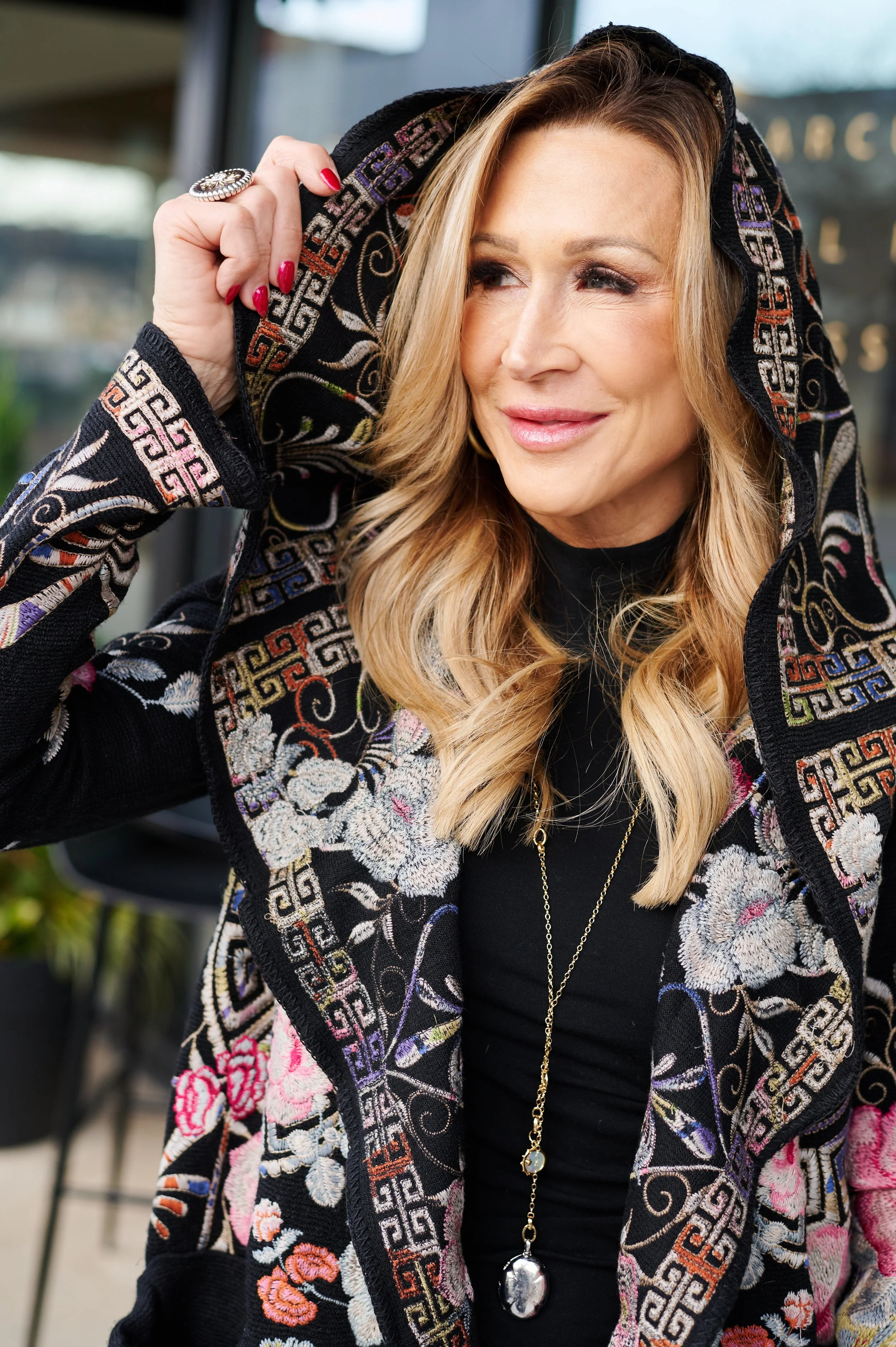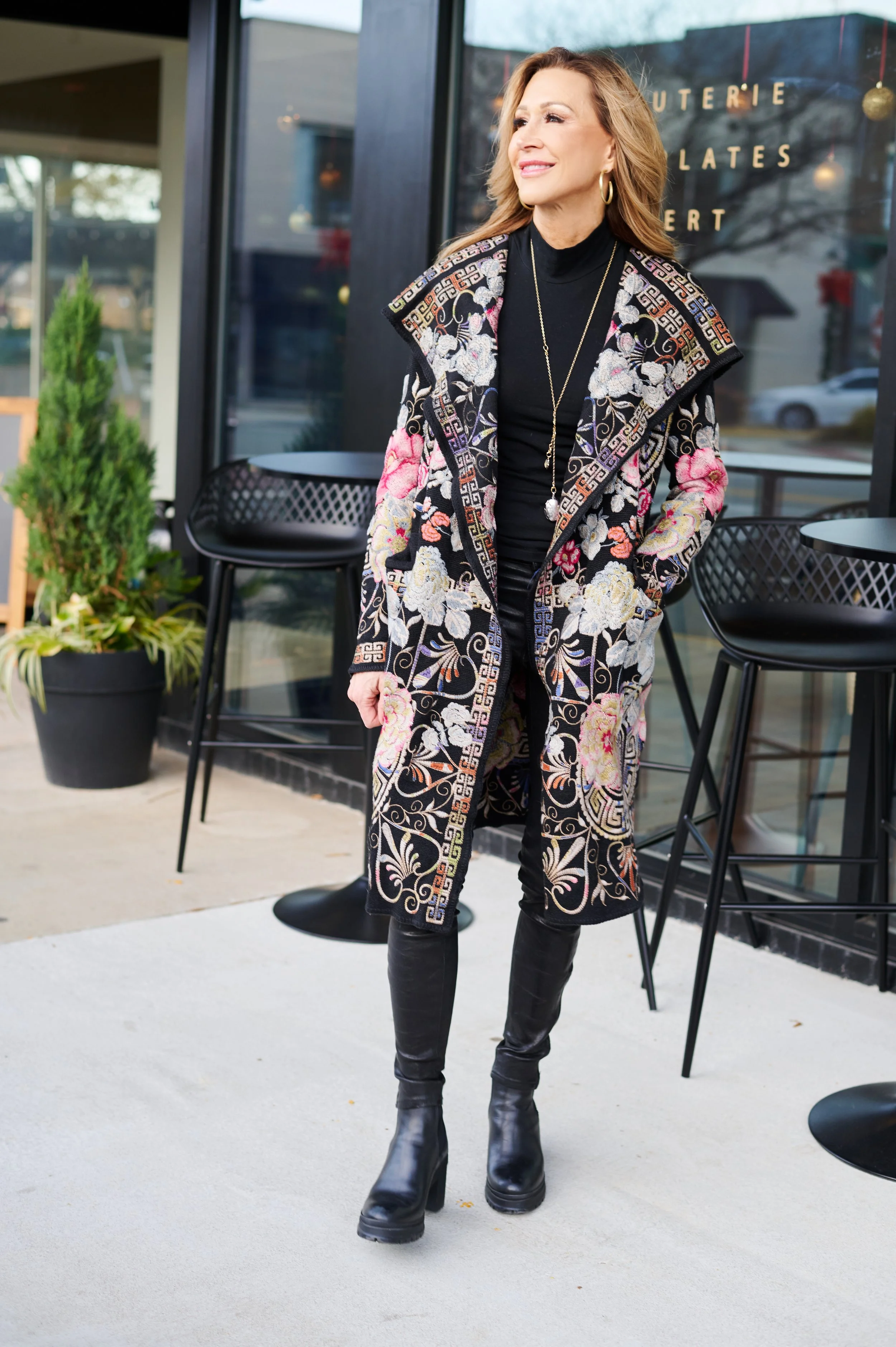 The jacket I’m wearing here is one of my absolute favorite pieces from Johnny Was and it’s very easy to style because it makes such a bold statement! I’ve styled it here with black leather pants, Stuart Weitzman boots, a black mock neck top and my locket from Monica Rich Kosann!