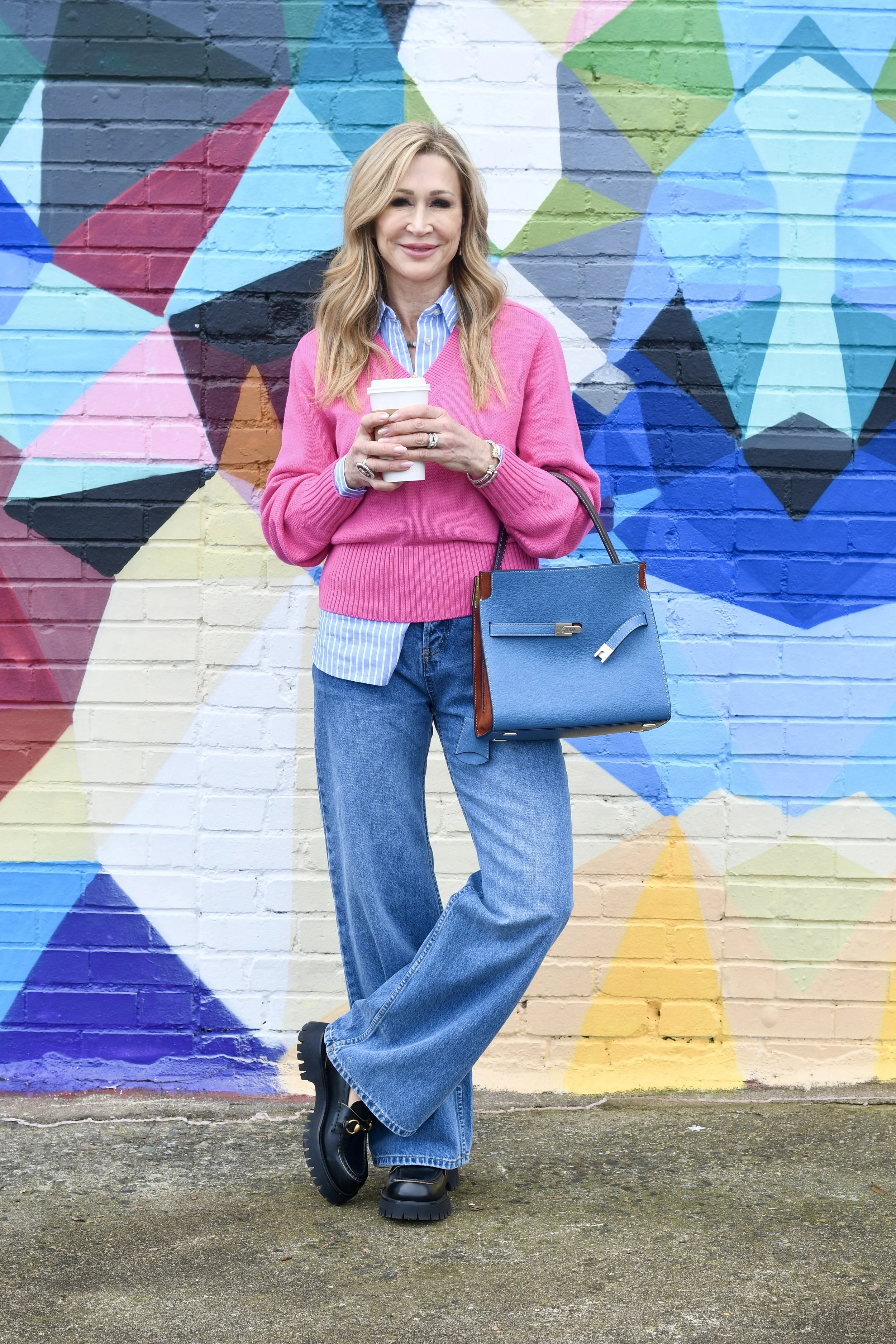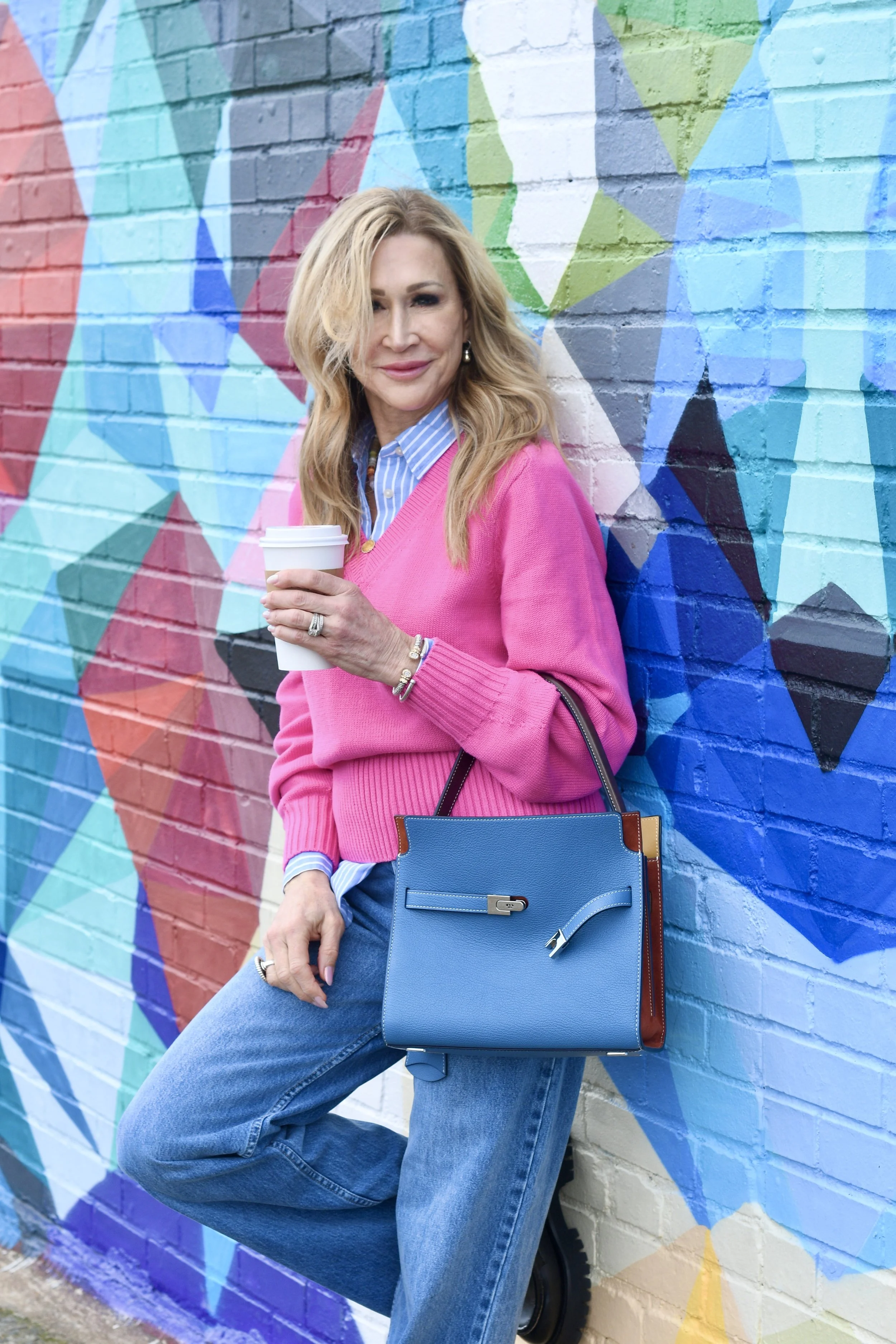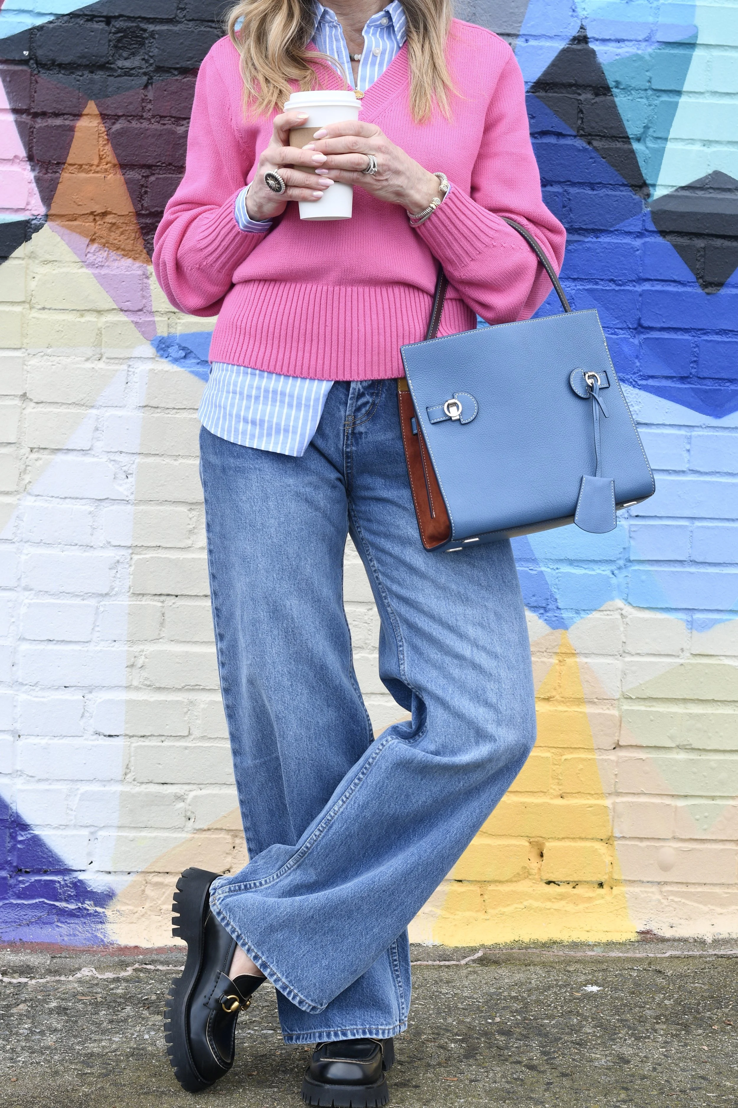 I paired my pink sweater with wide leg jeans (these are similar), my Gucci lug sole loafers (these are really comfy now but it took a while to break them in), a blue and white striped blouse from Loft and my Tory Burch bag that I purchased in NYC over Christmas! I really love this outfit and got so many compliments all day long!