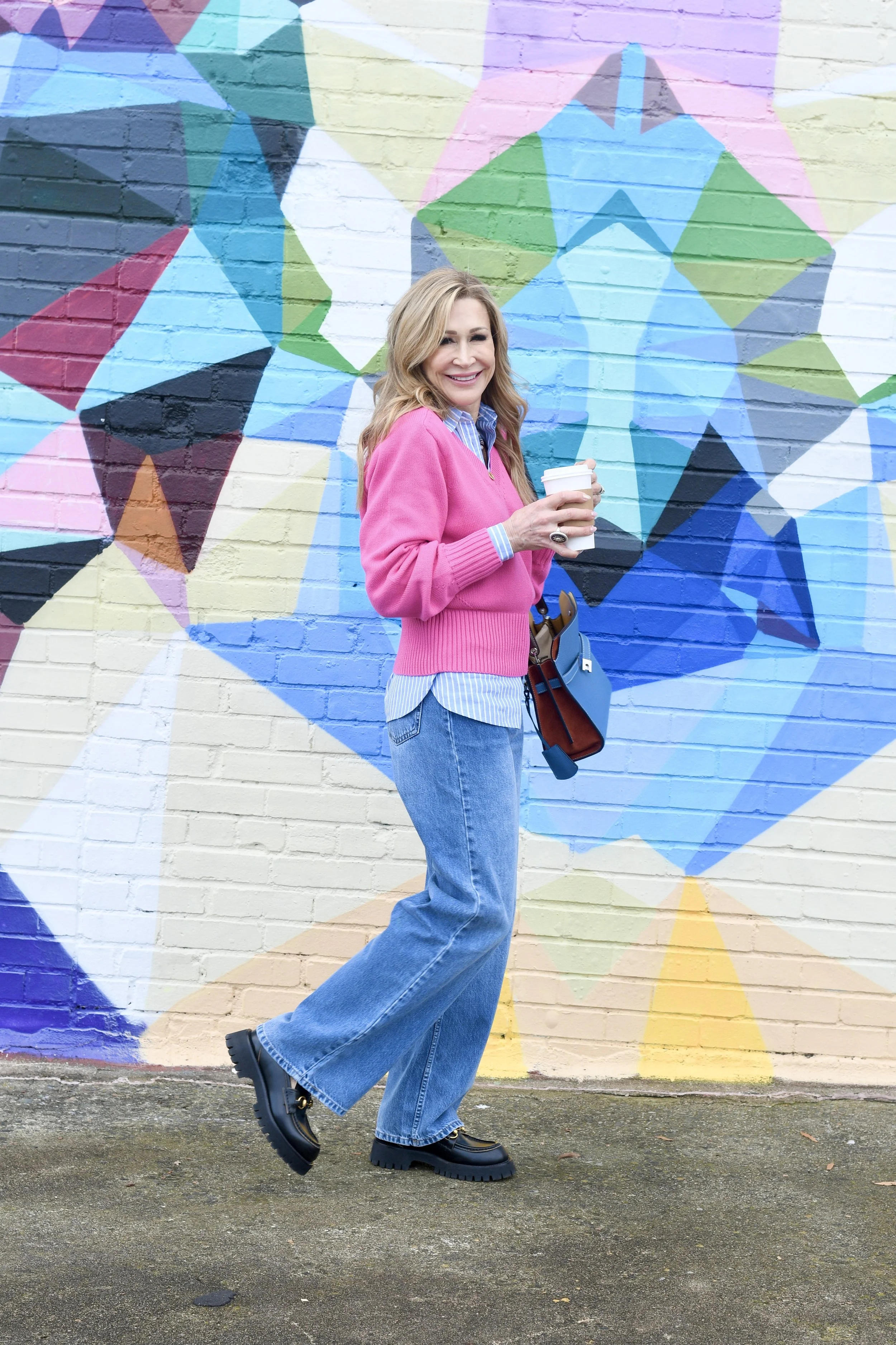 Last week, in an effort to bring a little color to these short grey days and boost my mood, I decided to step out of my (winter) box just a little and I put together this colorful look! It’s funny because it reminded me so much of something my mom would have worn with the exception of the lug sole loafers! She really loved pink and light blue and wore those colors all of the time!