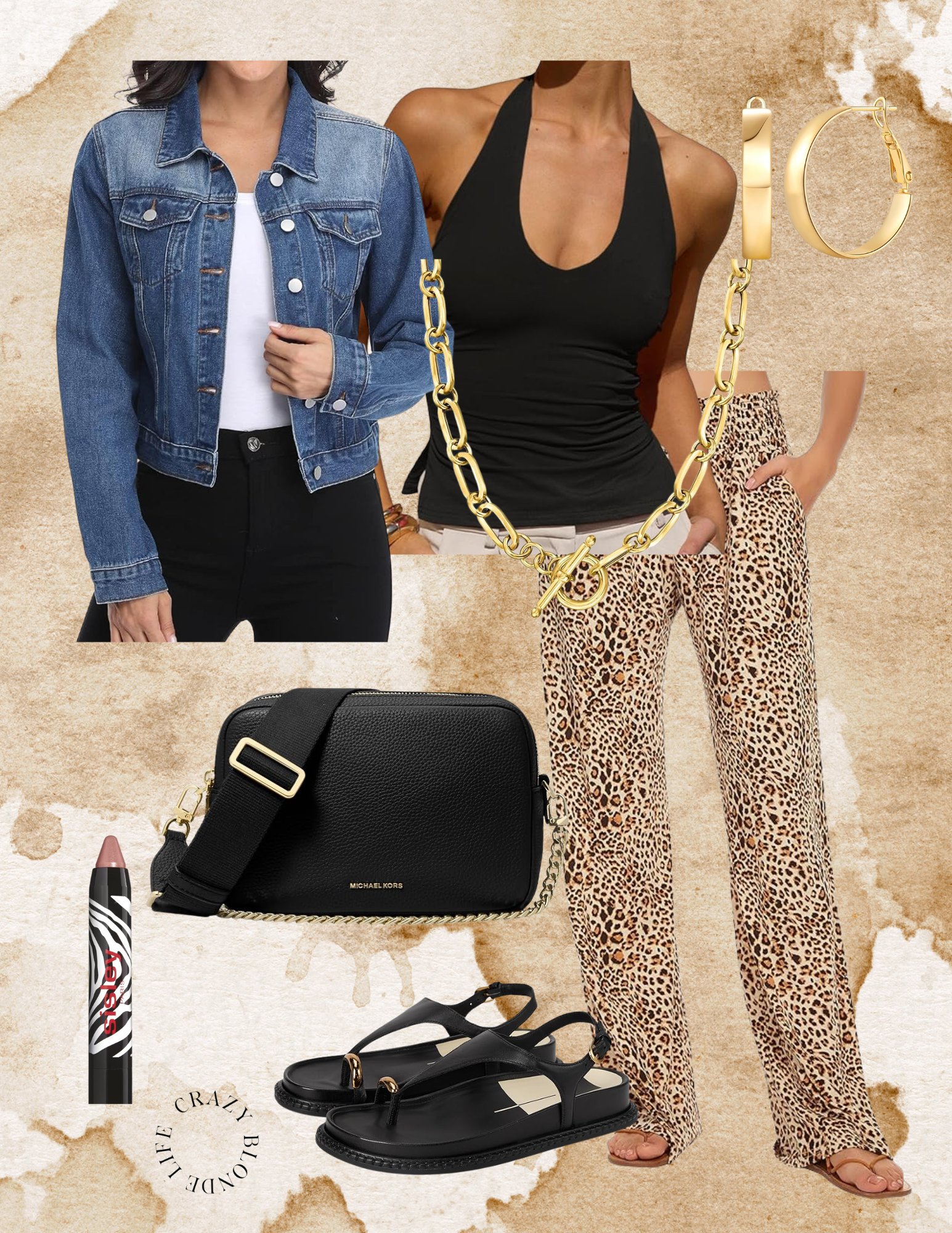 A chic look that features versatile pieces for now and laterβ¦leopard print pants (these are so cute), a cropped denim jacket and a black tank top create a stylish fall transition look. Gold jewelry complements black Dolce Vita sandals and a black messenger bag adds a polished finish.