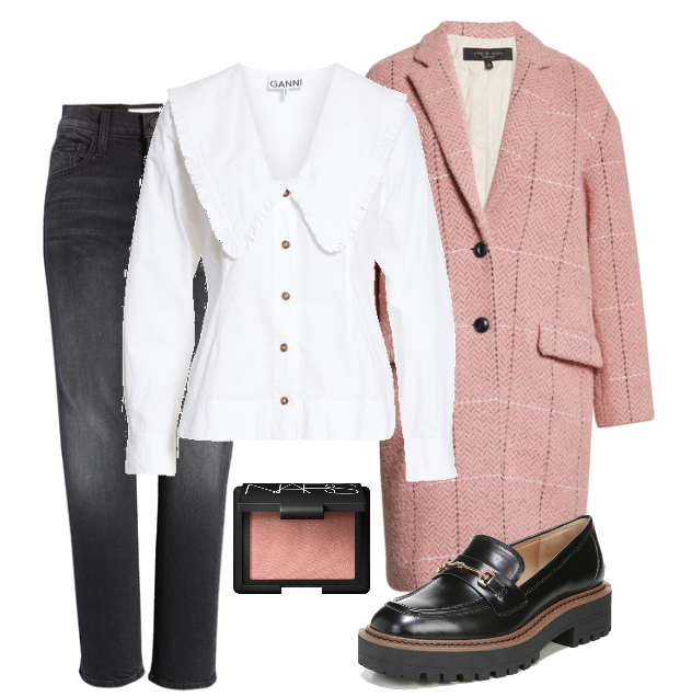 If you’re a fan of baby pink, you’re definitely in luck because it can be paired with nearly any color and this pink coat will take you right into spring. It’s classic shape and styling ensure that it will be in your closet for many years to come! Here I’ve paired it with grey jeans, a beautiful and feminine ruffle collar blouse and on-trend platform loafers!