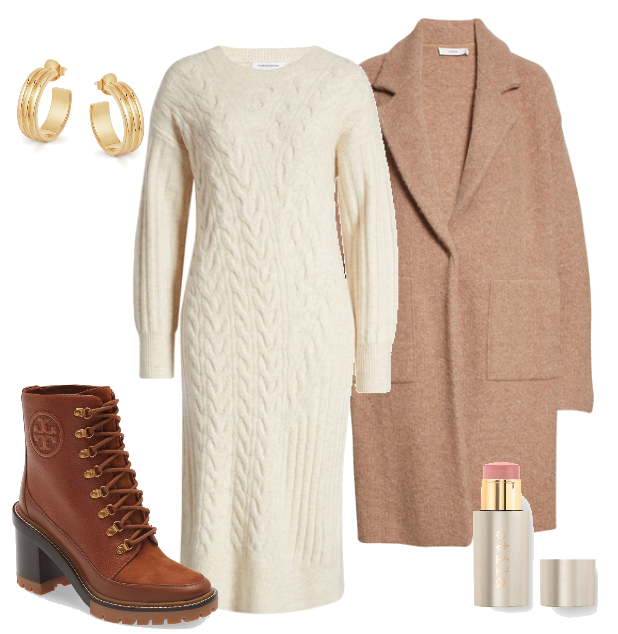 Sweater dresses have been front and center this season probably they are so stylish and warm. Add a pair of tights, some fabulous lug sole boots from Tory Burch, a classic wool coat (half price) and you’ve got a winter look that’s anything but basic!