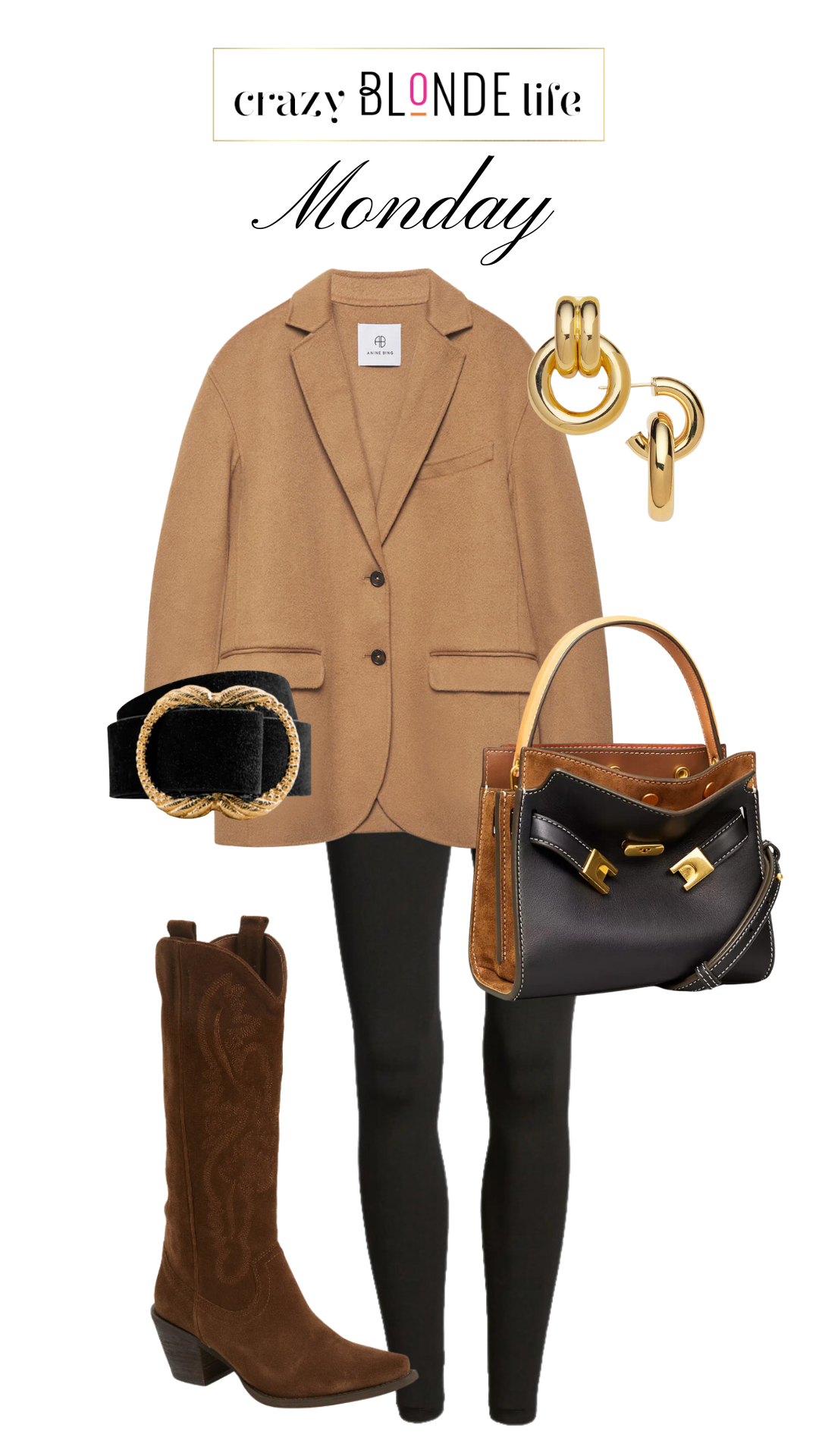 In the outfit above, what jumps out at me is the combination of camel, black and chocolate brown. So, I do have a pair of very old chocolate brown boots that I’ve been thinking I should pull out and that’s where I would start with this look. I definitely would put on a white tee under the blazer and probably wear a black blazer instead of a camel one. Just play around and see what you come up with…you might be surprised!