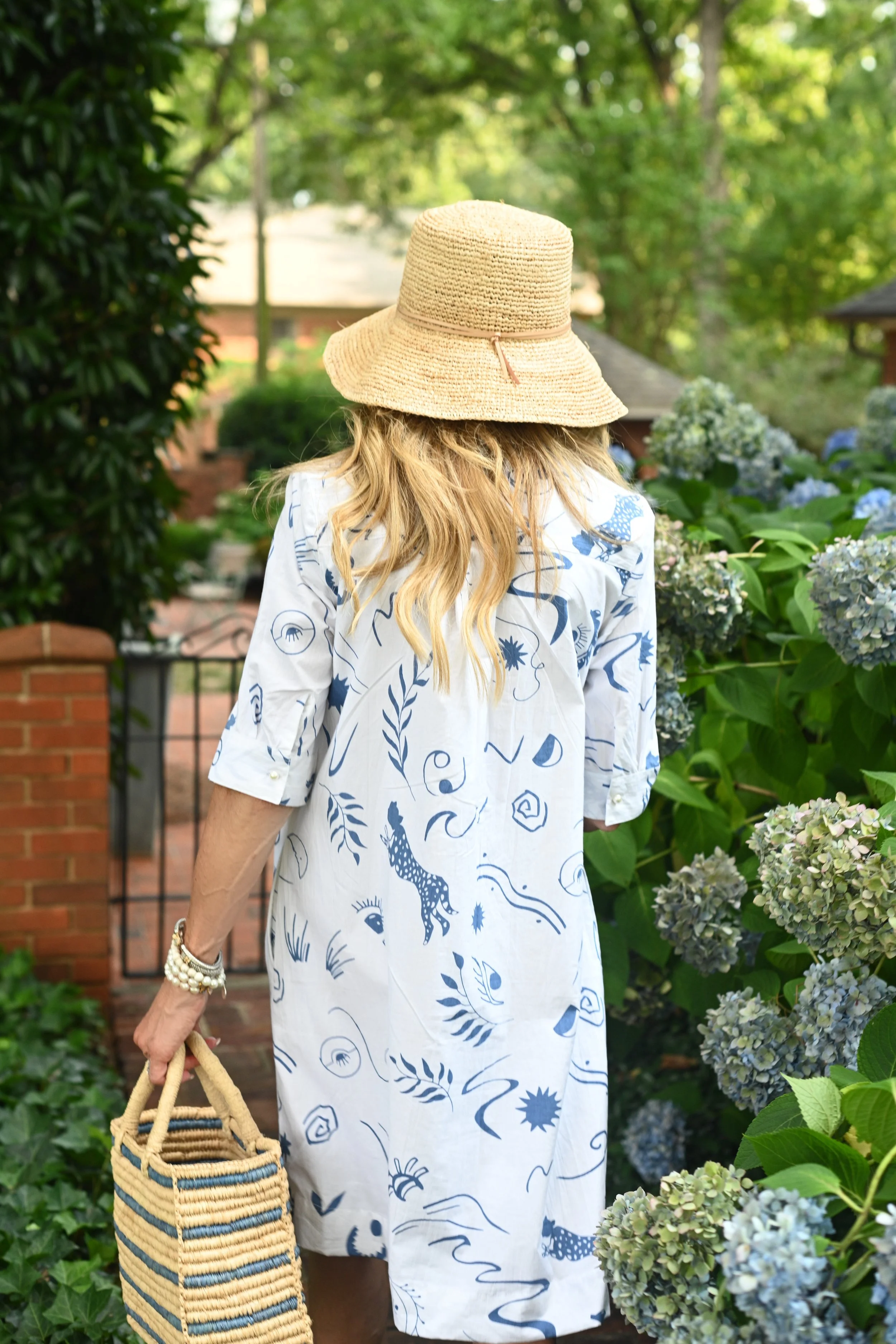 Imagine a charming garden party set in the soft glow of late afternoon. The vintage Palm Beach powder blue table, draped with a beautiful blue and tan floral tablecloth feels timeless. Wicker lamps cast a glow as fresh bread, a cheese board featuring blue cheese with local honey, and a delectable Gruyère puff pastry tart and fresh herbs along with a summery, light bottle of chilled rosè invite guests to indulge and linger. Blooming hydrangeas and a beautiful flower arrangement in an antique metal container add vibrant color, while candles flicker softly in a stone birdbath nestled among the greenery. This idyllic setting is meant to be a relaxed garden gathering, where beauty, nature, and good company come together on a summer afternoon.