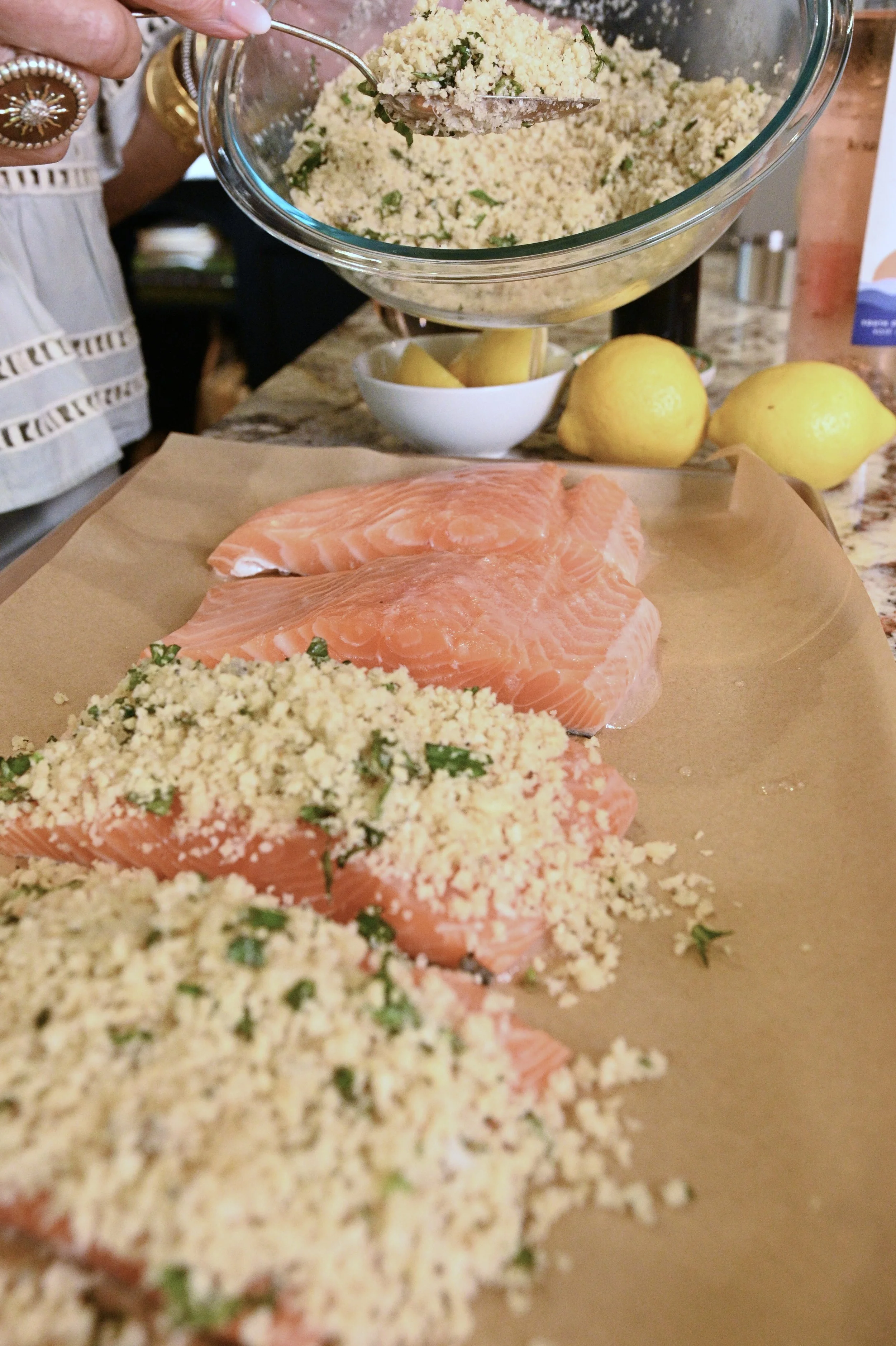 The panko/madacamia nut mixture gets very crunch as the salmon bakes…if it starts to get too brown, place the salmon on a lower rack in your oven. This recipe is fancy enough for company and easy enough for a busy weeknight!
