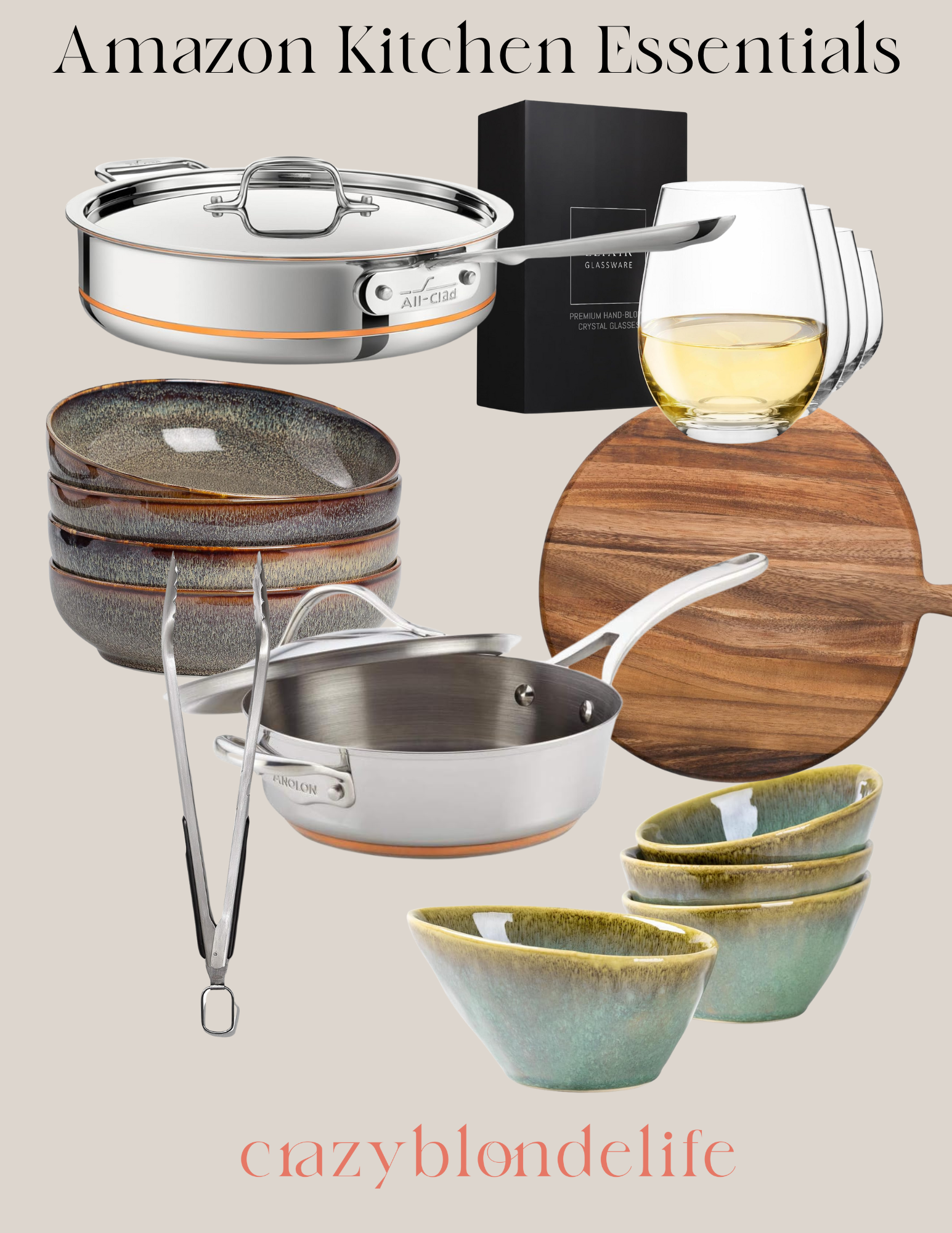 //All Clad Sauté Pan//wineglasses//charcuterie board//ceramic green bowls//sauté pan//tongs//grey bowls//