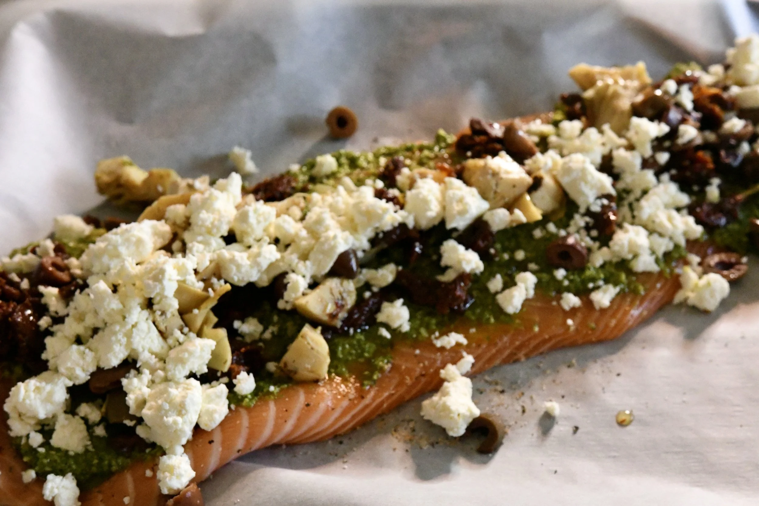 Here is the recipe…it’s really so easy to make and the proportions are very general. If you like more olives, add more olives and the same with artichokes and sun dried tomatoes or add goat cheese or some parmesan! Also, if you can’t find the exact salmon seasoning, feel free to use any you have, or substitute a little garlic powder. You really can’t go wrong with this recipe! I hope you enjoy!
