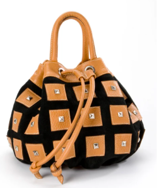 Black linen and cognac leather bucket bag with studs' details. Side straps. Fully lined. Interior zip pocket and two media pockets.