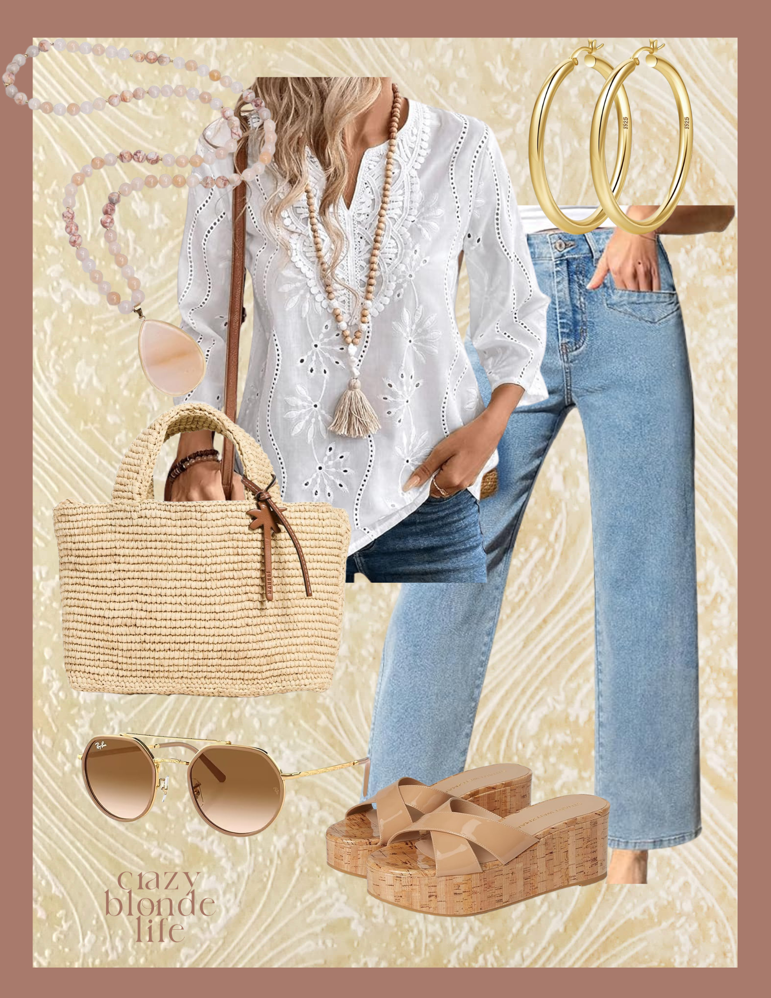 //Beaded Necklace//White Top//Gold Earrings//Cropped Jeans//Stuart Weitzman Wedges (these are also really cute)//Ray Ban Sunglasses//Raffia Bag//