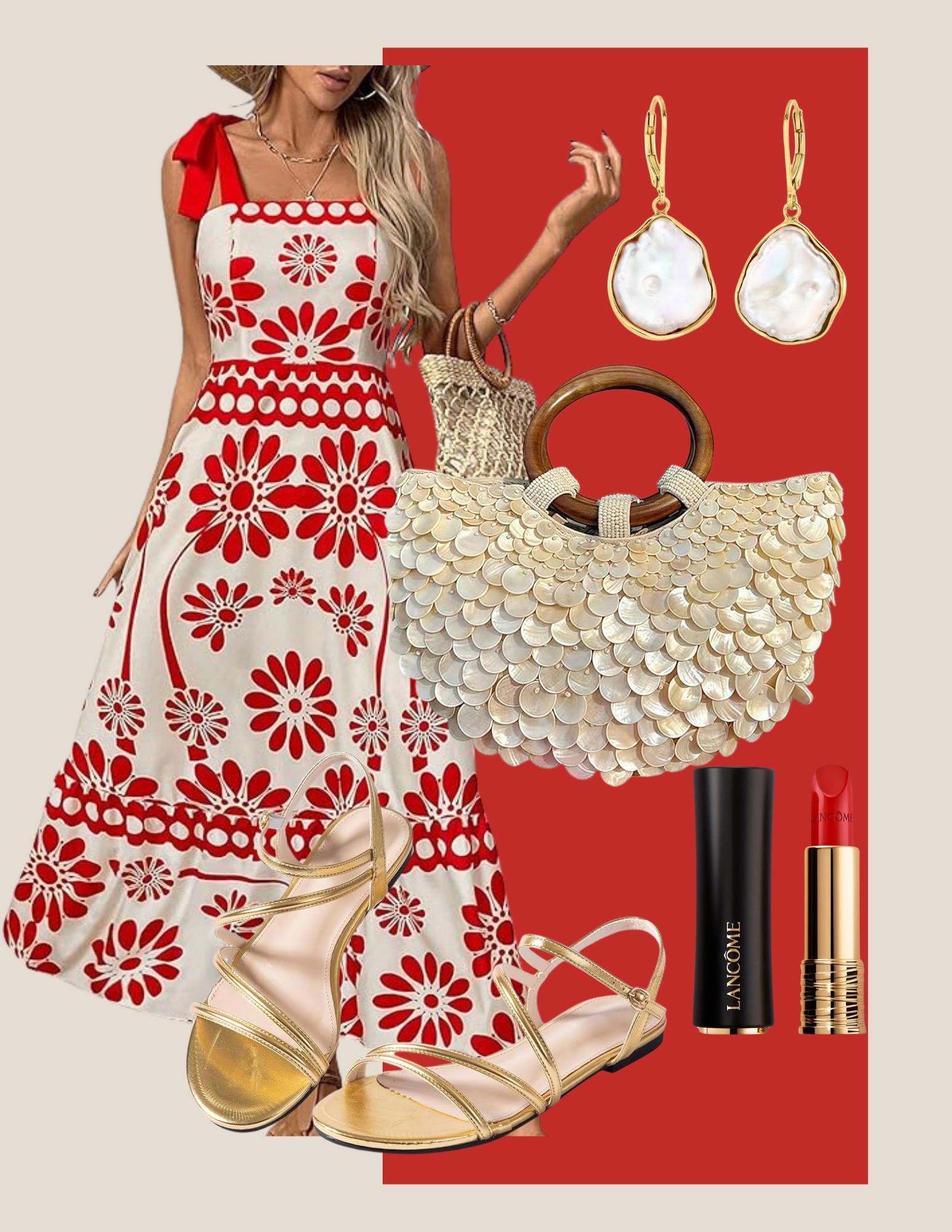 Moving right along from aqua to red…this dress is such a great Farm Rio dupe (here’s the one from Farm Rio) that I just had to make an outfit with it! The bag is also a great dupe for this bag from Anthropologie! You don’t need to spend a fortune on every bag…sometimes an inexpensive one makes a big statement and adds interest to your look!
