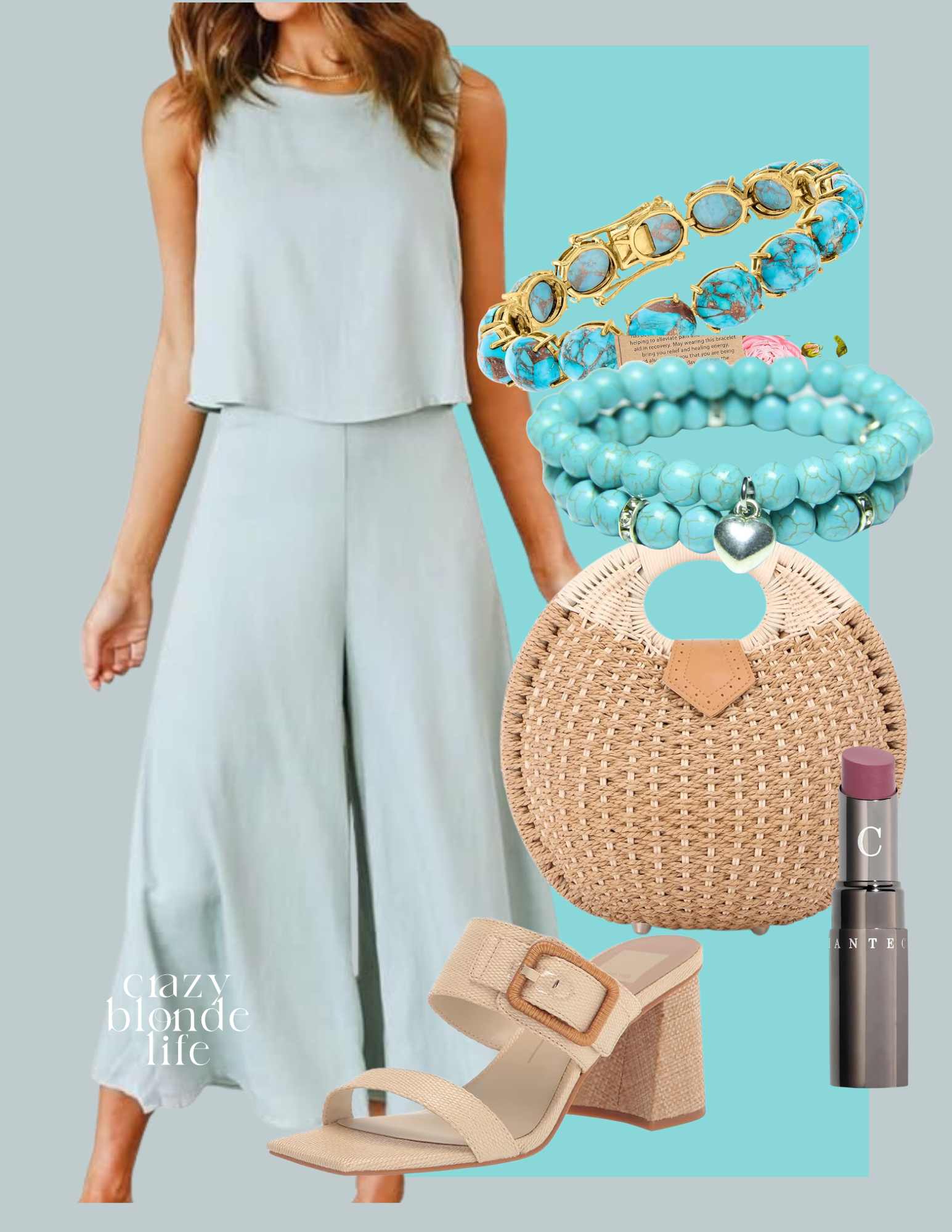 //Aqua Two Piece Set//Turquoise Bracelet//Turquoise Beaded Bracelet//Lipstick//Dolce Vita Sandals//