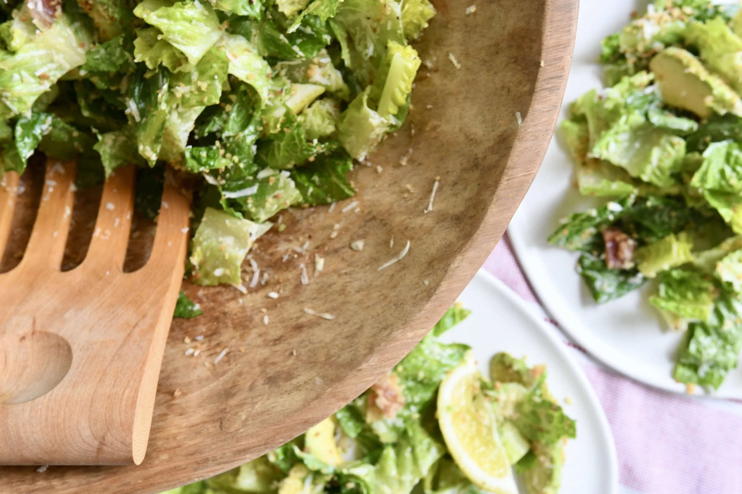 I have been wanting a Caesar Salad bowl for quite some time and my daughters gave me this gorgeous one for my birthday! I served the salad on dinner plates from Haand Ceramics and the salad looks so pretty on a white plate!