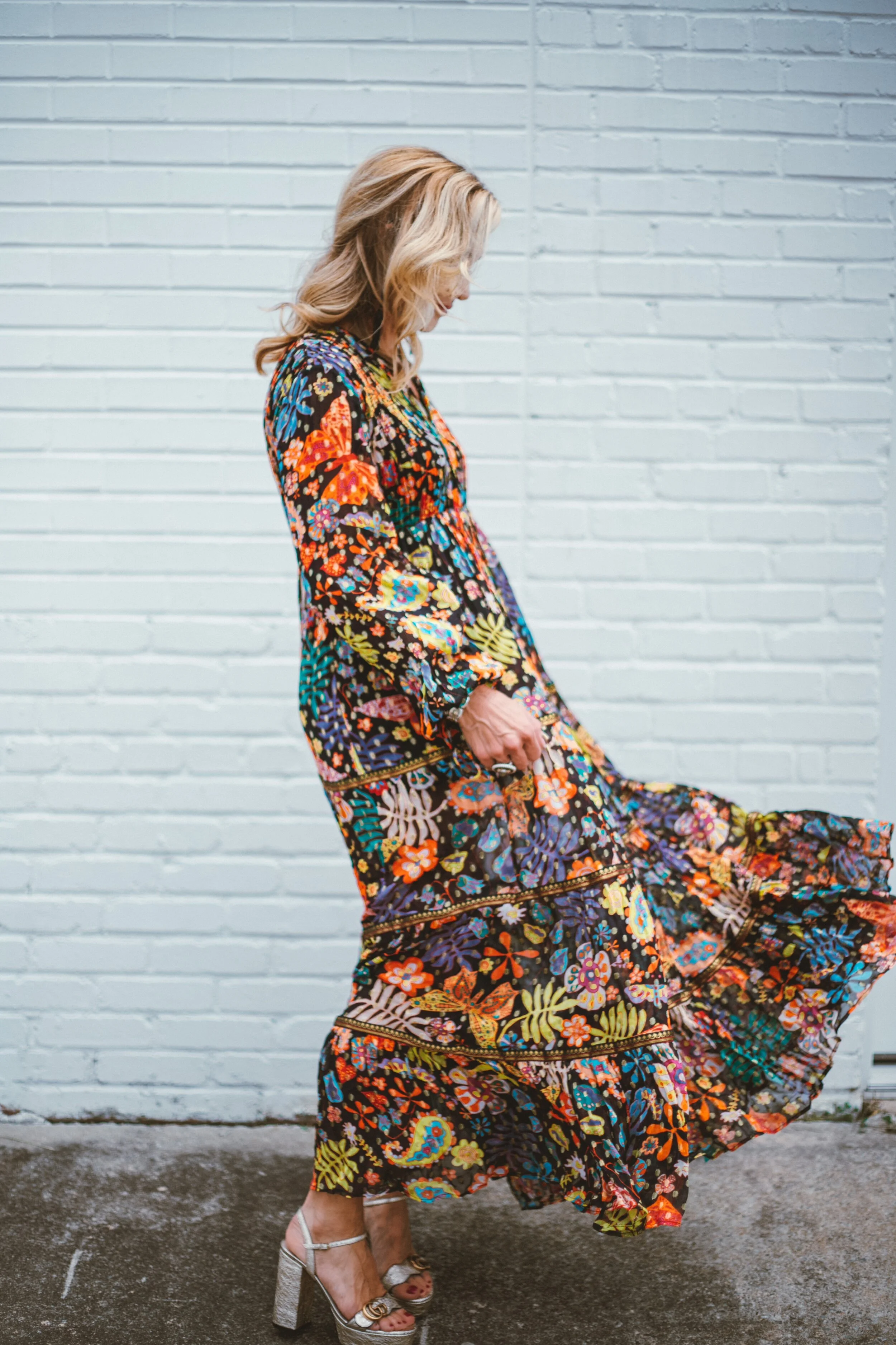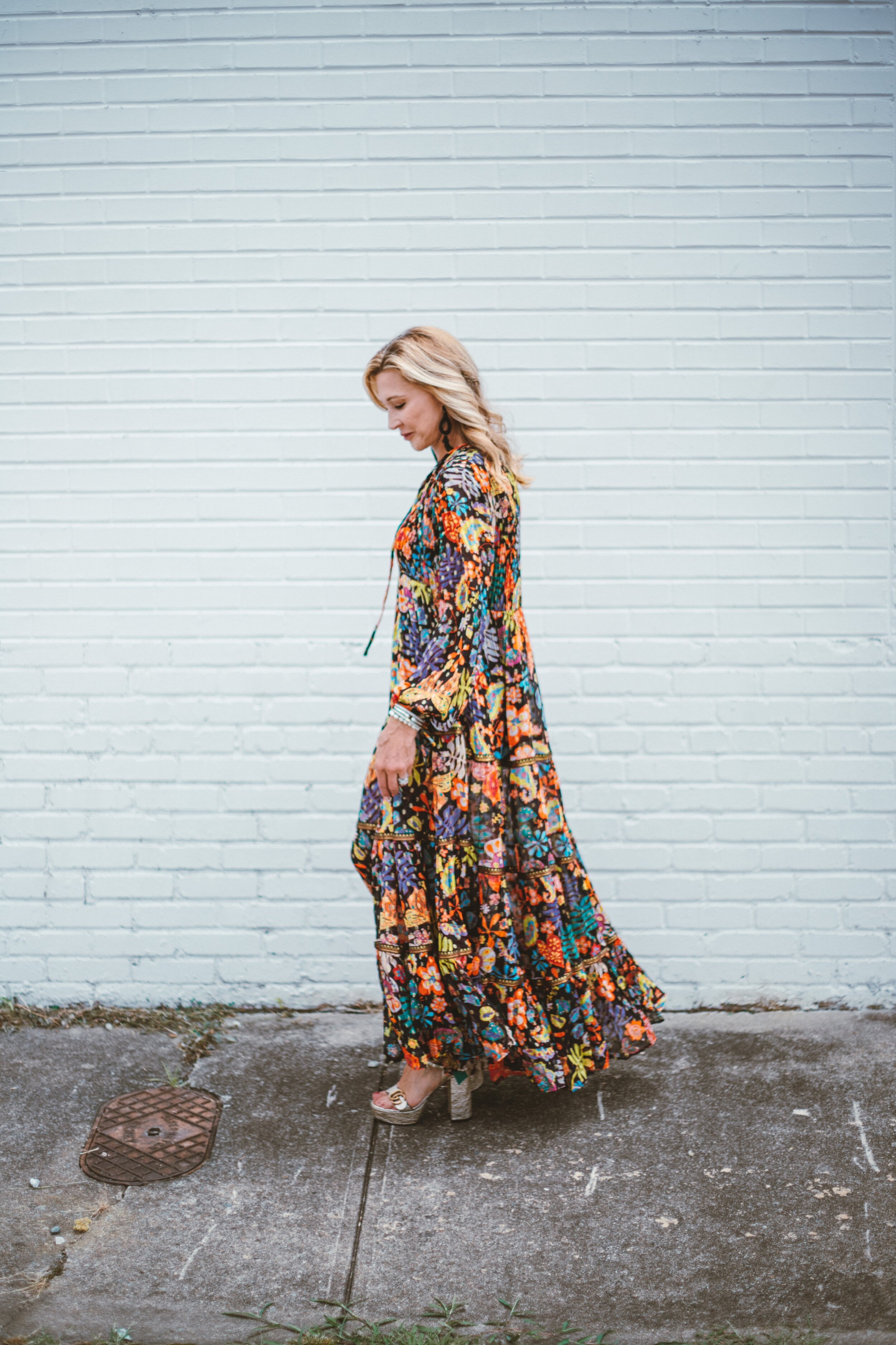 I will admit that I was a little warm wearing this dress during the daytime for these pictures, but I think this dress would be perfect for an evening under the stars and it will totally go right into the fall! It has so many fabulous colors and the metallic threads running through are beautiful!