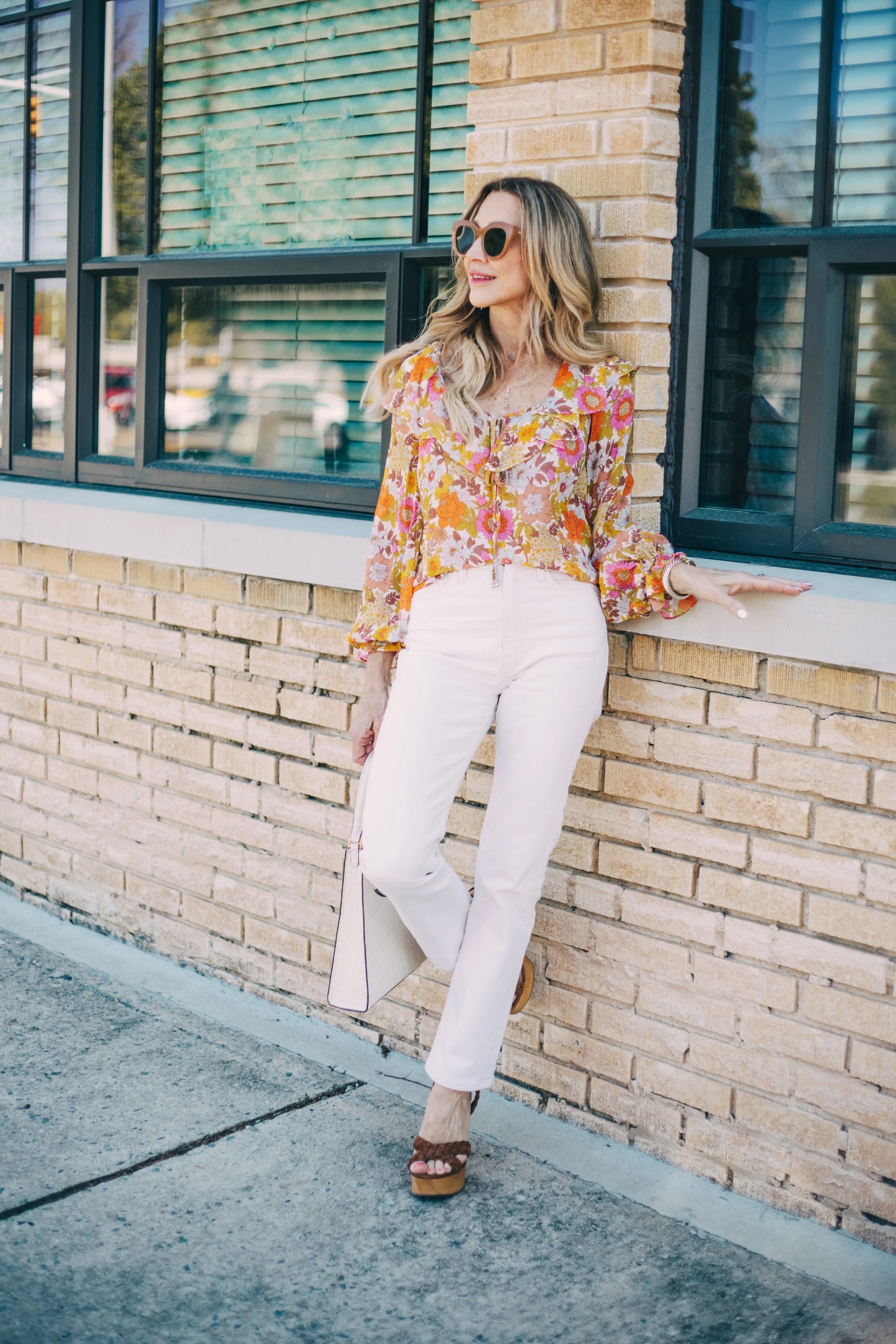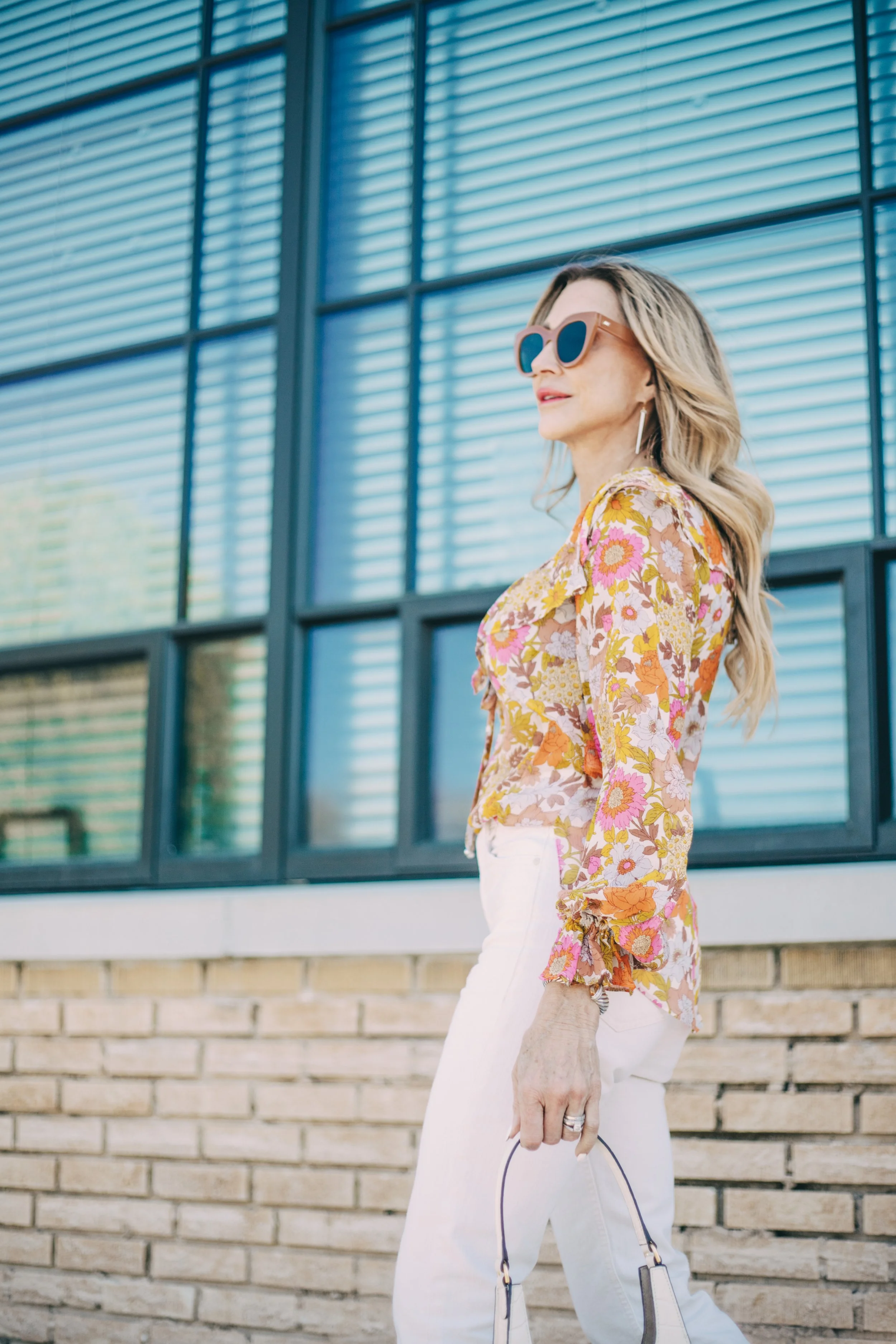 Today’s focus is on this amazing floral blouse! This blouse will carry me into summer and then into fall! It’s somewhat sheer, but not too sheer…I love the neckline, the cut and the colors! I paired it with a pair of straight leg jeans from Mother and my sandals are…you guessed it, Veronica Beard! My sunglasses are Celine and several seasons old as is my bag from Staud. I’ve linked similar!