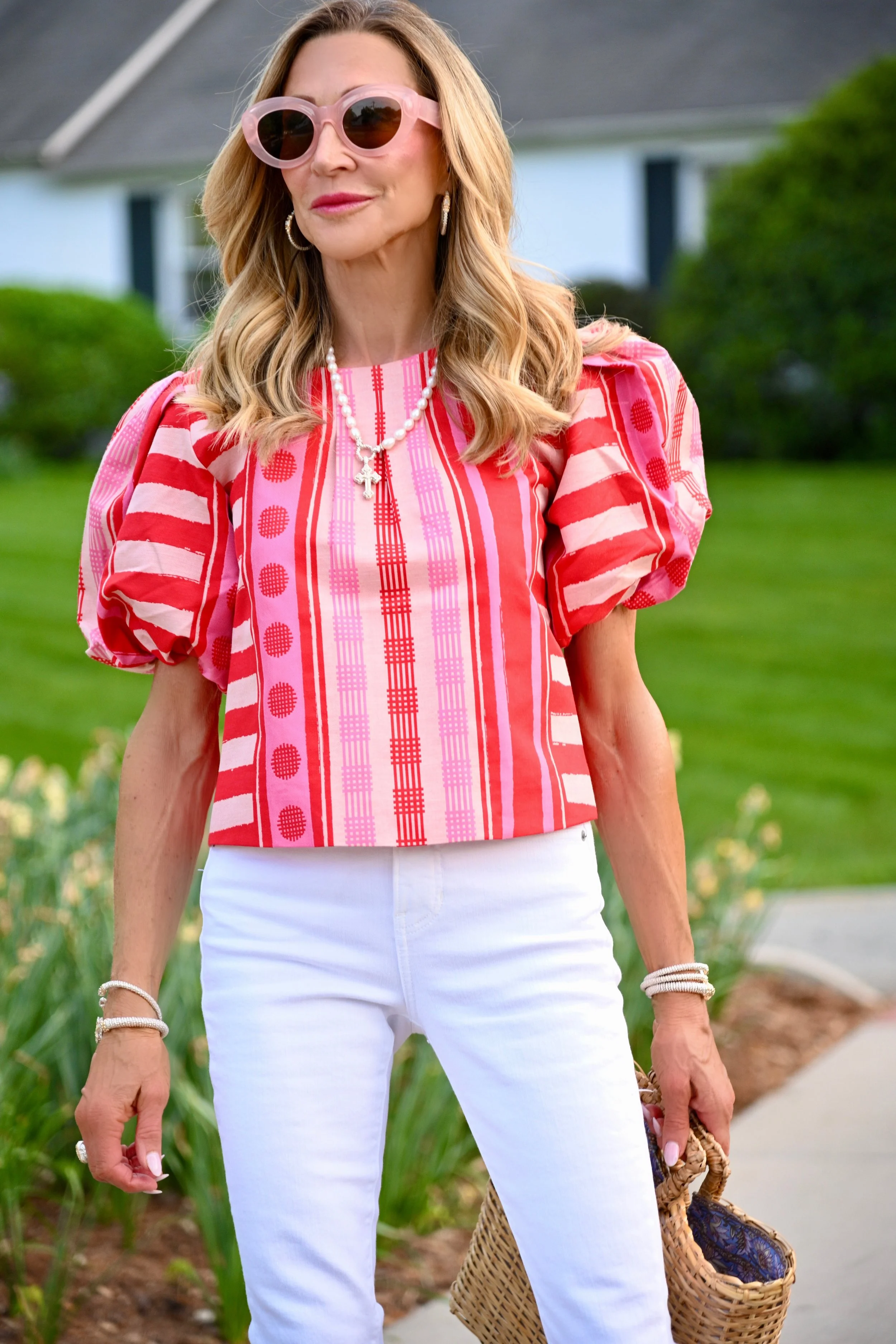 I paired it with the Beverly Skinny Flare from Veronica Beard…white denim, clean and leg elongating, and the combination is exactly right. The rattan tote bag is also from Veronica Beard, which gives the whole look that easy, warm-weather polish. My platform sandals are from Steve Madden and they are surprisingly comfortable given the height. The sunnies are from Amazon and I’m loving the pink!