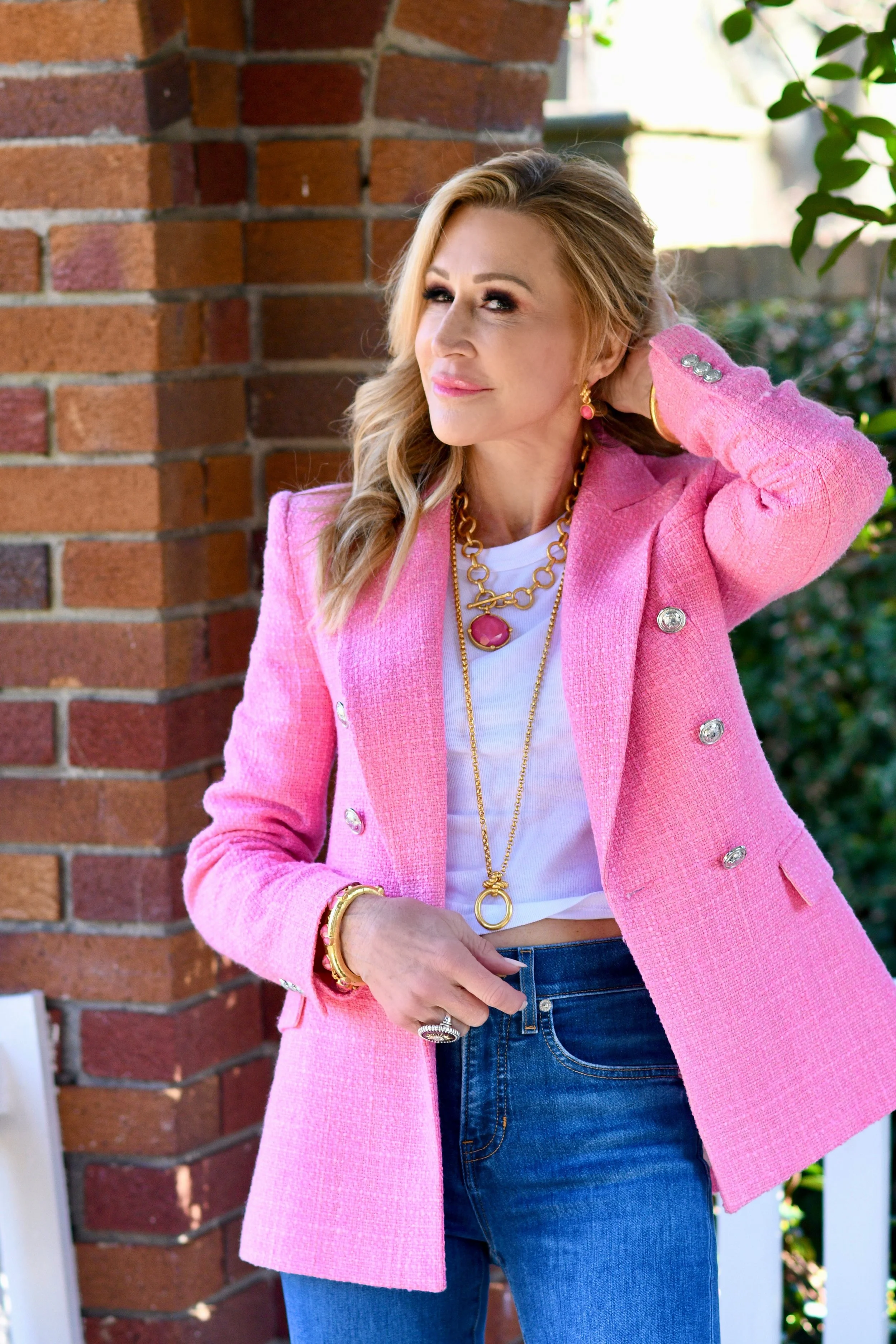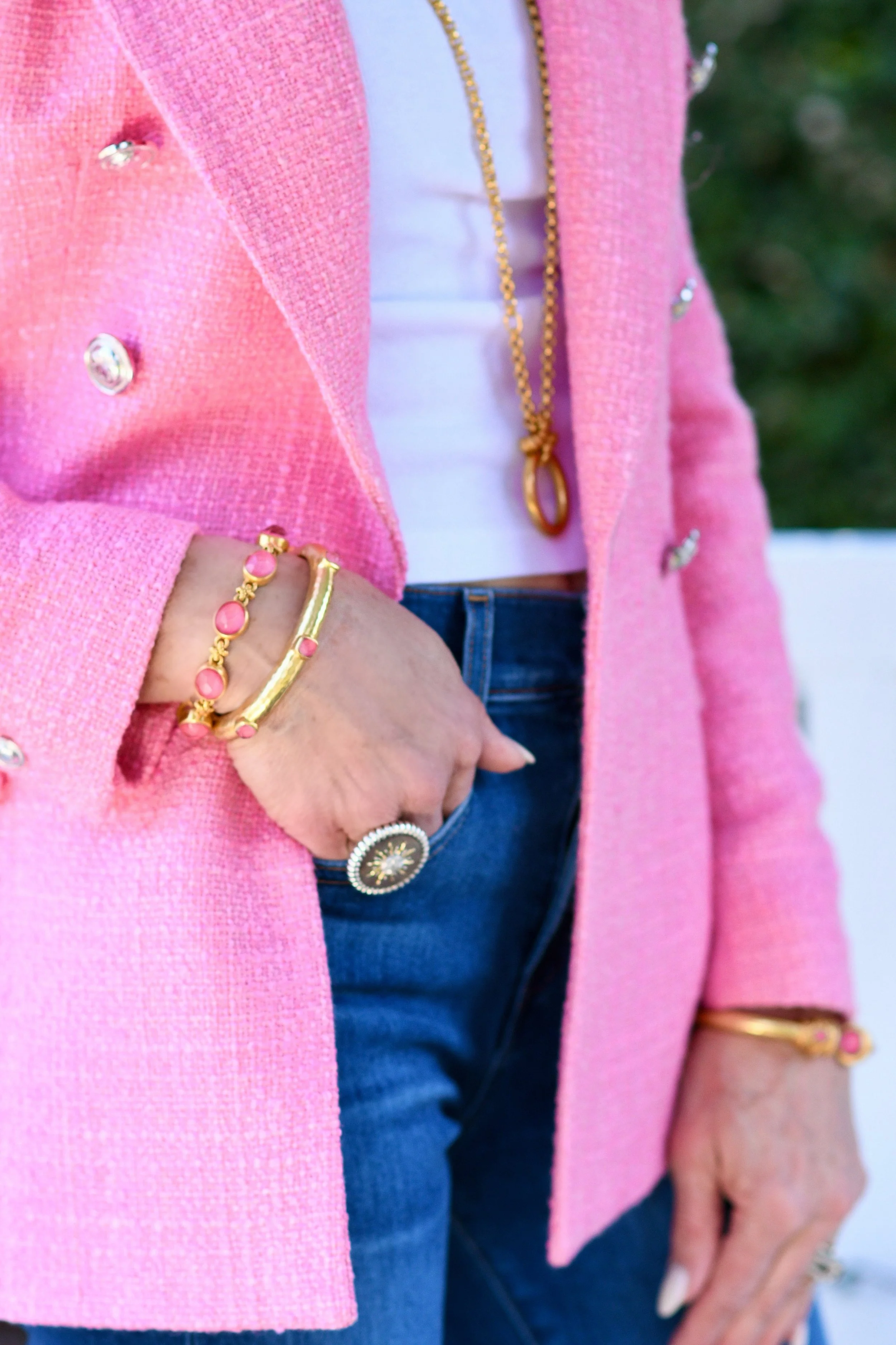 Today, I wanted to share my favorite new jewelry from Julie Vos! This jewelry is so gorgeous and I am dripping in pink and gold! I thought it was perfect with this older pink blazer from Zara (similar here), dark wash flare jeans from Veronica Beard, pink patent leather shoes from last season and a white tee! The jewelry really elevates the look and itβs so perfect for spring!