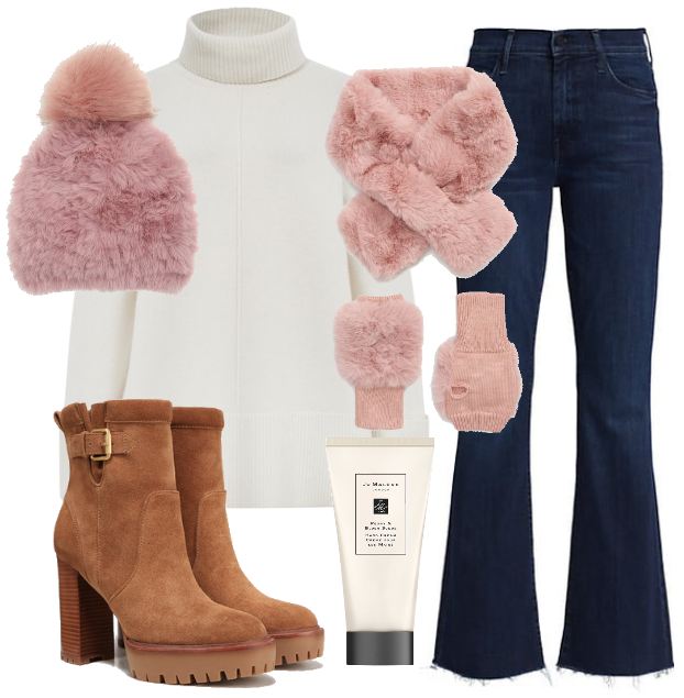 Along with up grading my pj’s, I’ve also been on a mission to be cozy! The temperatures here have been up and down, but on a cold morning, I want something soft and cozy! I love an off white sweater and jeans combined with a pair of fabulous boots and this classic outfit is anything but basic when paired with these gorgeous pink accessories! A good hand lotion is essential this time of year and Jo Malone makes the most delicious smelling ones!
