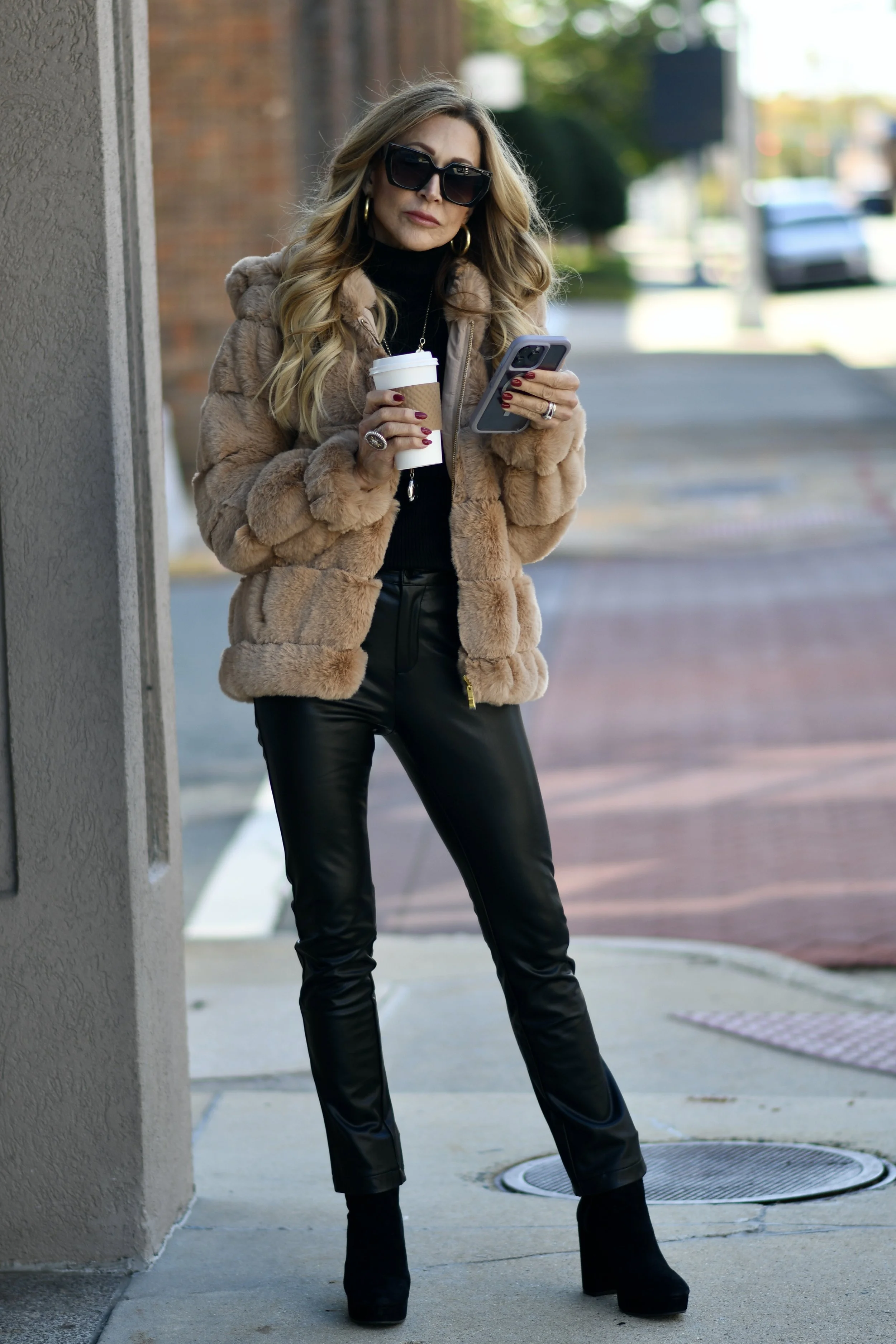 I am really a coat girl and believe you can never have too many coats! The one pictured here is faux shearling and faux fur. I love the pockets and the color is perfect for throwing on with basically anything! I’ve styled it with the black faux leather pants and off white turtleneck! Perfect for a crisp fall day!