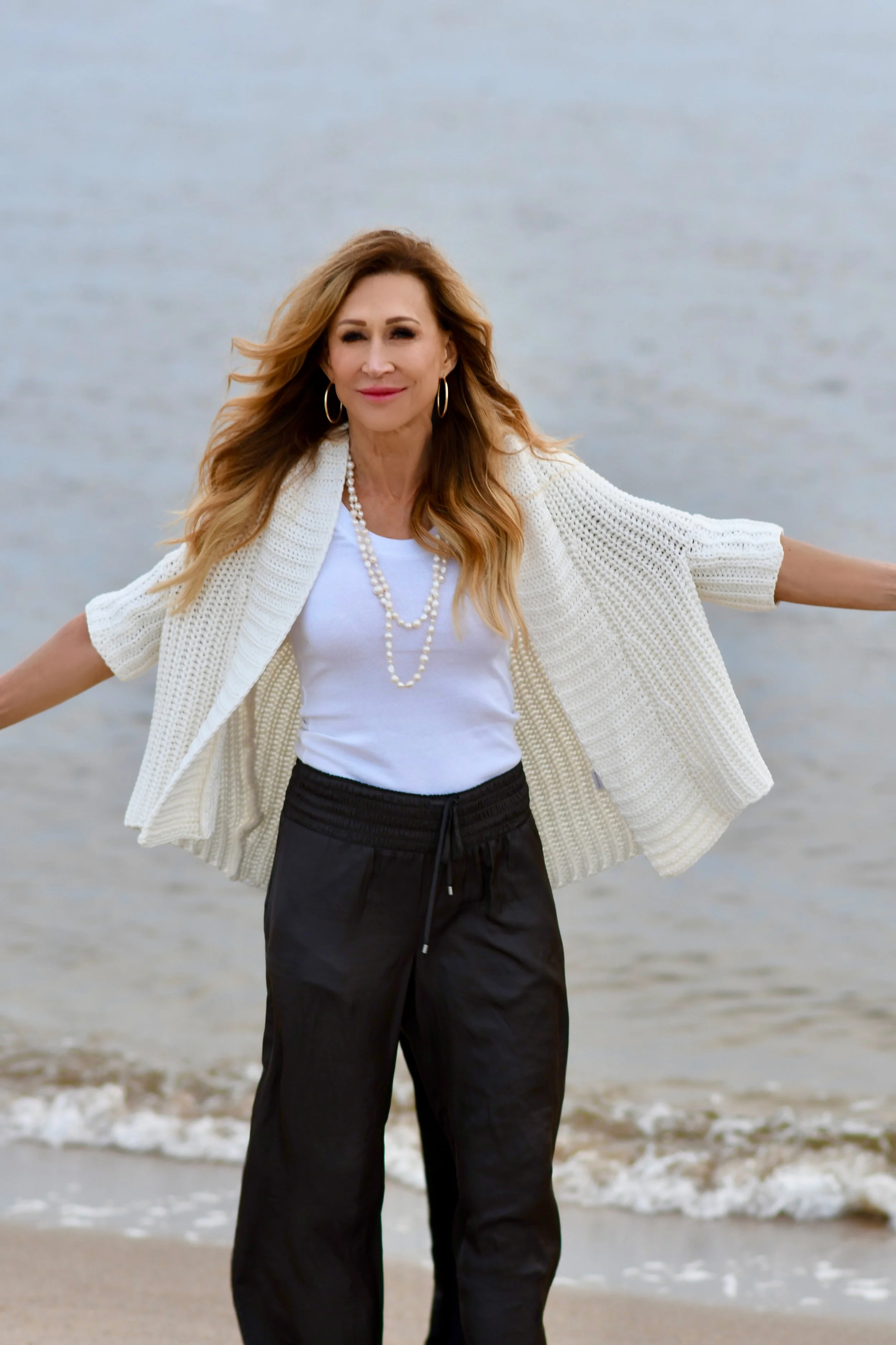 The sweater is like a light, wearable blanket! I love it over a tank…white, off white, black or a tobacco color would be beautiful! This is elevated loungewear at it’s best!