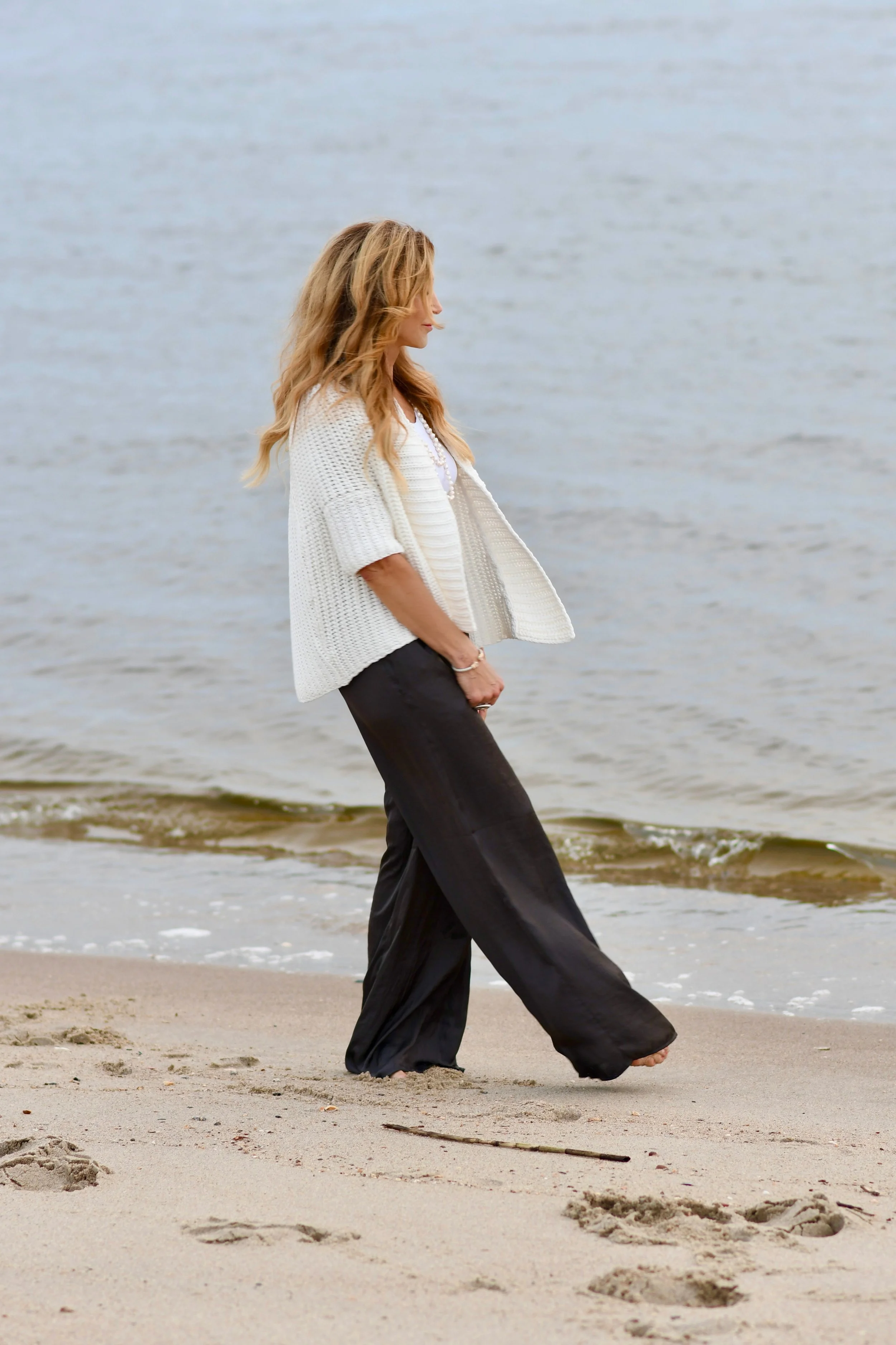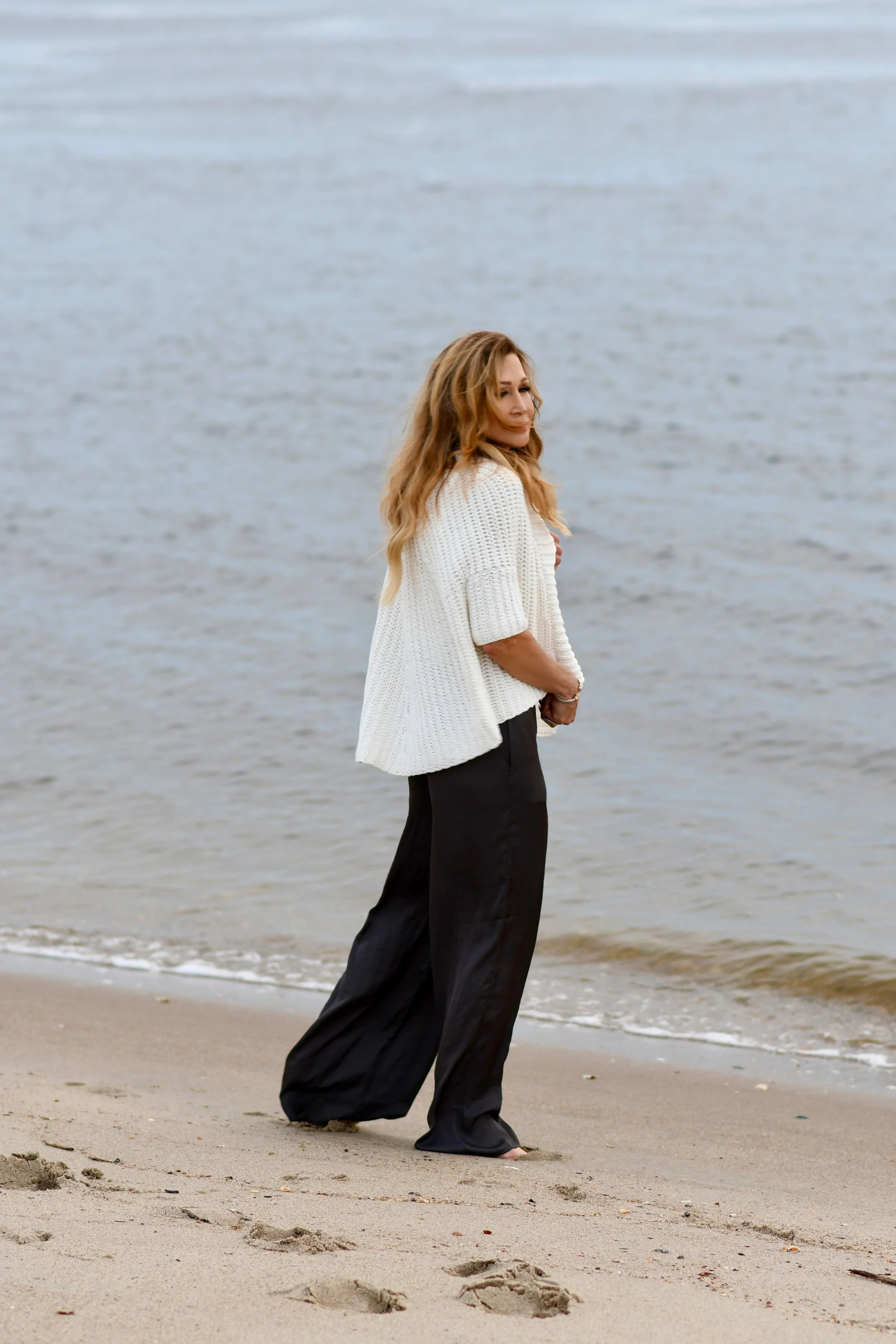 In these pictures, I’m wearing the Fida Shrug in salt white along with the Gorga pant in brownstone. The satin pants are so comfortable, soft, flattering and versatile…wear them with a tank when it’s hot, or a heavier sweater. There is also a top that coordinates on the website (and linked below)! I’m a little on the short side, so if I wasn’t on the beach, I would wear an espadrille or other heel with these pants. They run true to size and I’m wearing an extra small.
