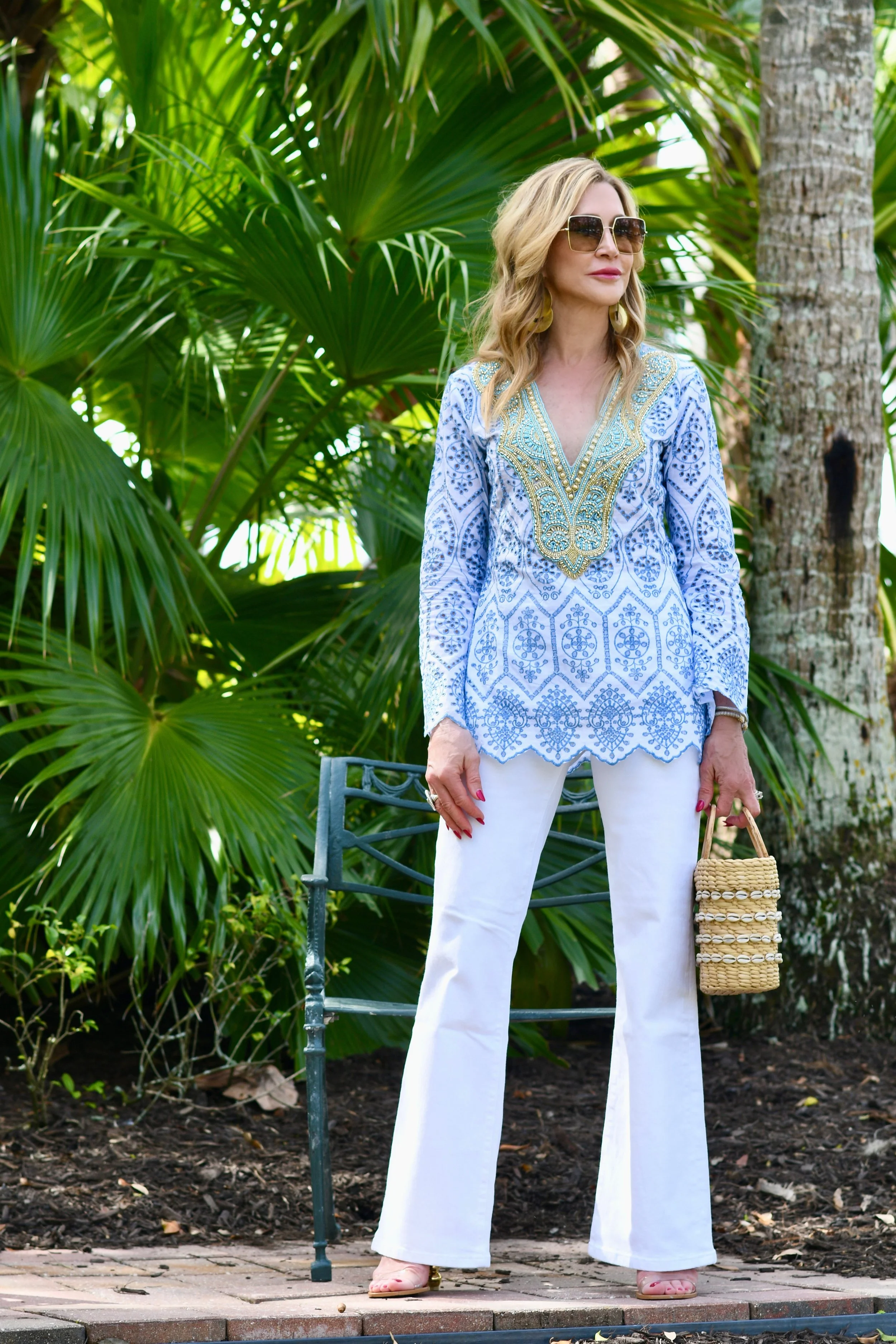 This gorgeous embellished tunic definitely makes a statement! I love it with white jeans (these are the same as above, only white), but it also looks great over a swimsuit! Again, this tunic is perfect for times when itβs a little chilly out and you need a sleeve! Add some statement earrings and a gorgeous pair of sandals and youβre ready for a casual dinner out!
