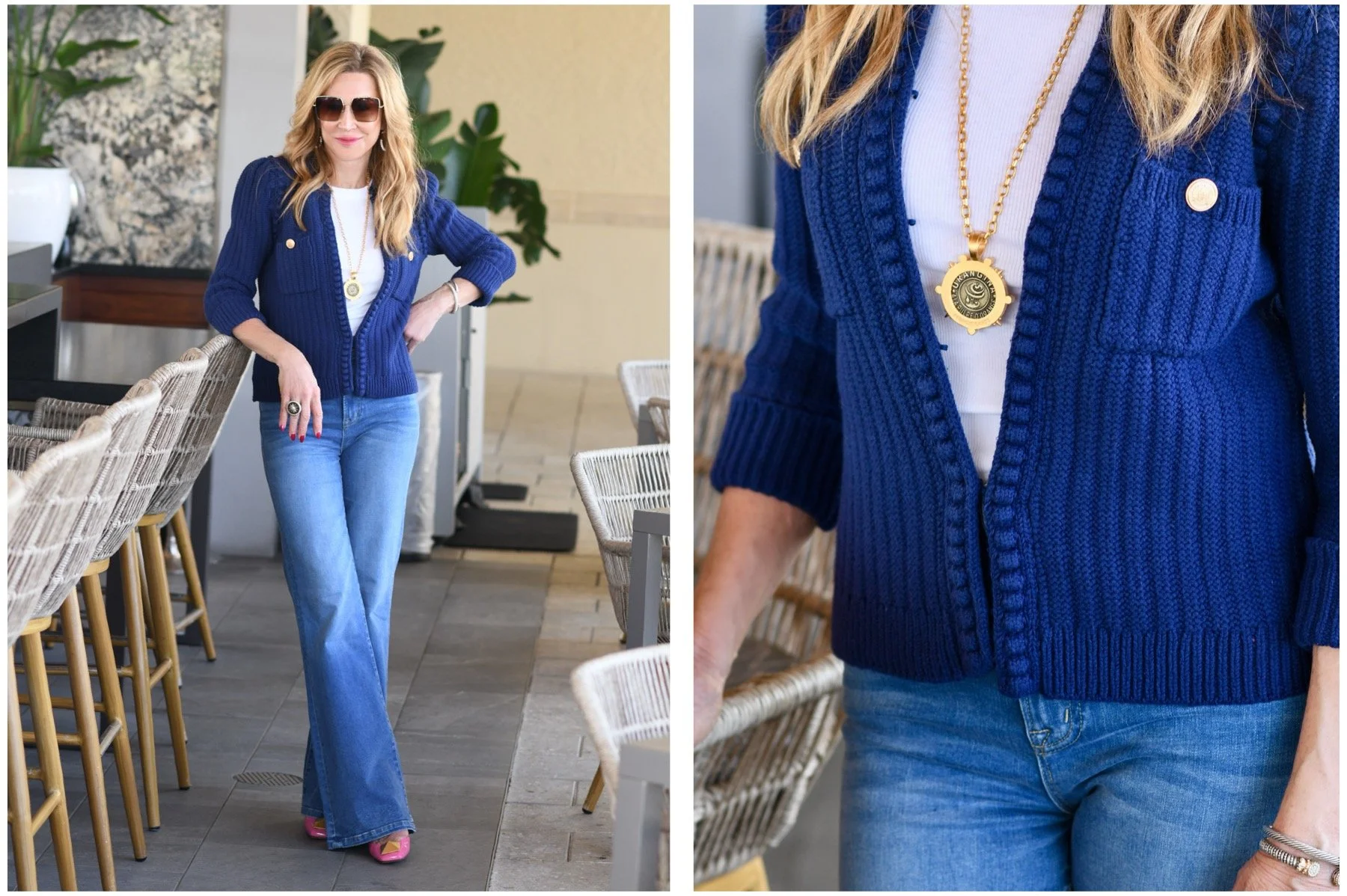 The βlady jacketβ has been such a huge trend this year and even though itβs a trend, itβs a very classic style that works well with jeans, trousers, skirtsβ¦you name it! The Boston Proper sweater Iβm wearing here is an unstructured sweater βlady jacketβ and itβs a great layer for those days when you need a little something extra! Iβm wearing it over a basic white tank with Boston Proper wide leg flare jeans. As you know, Iβm not a huge fan of high waisted anything, but these are cut well and comfortable. Iβll definitely be wearing this look many times this spsring!