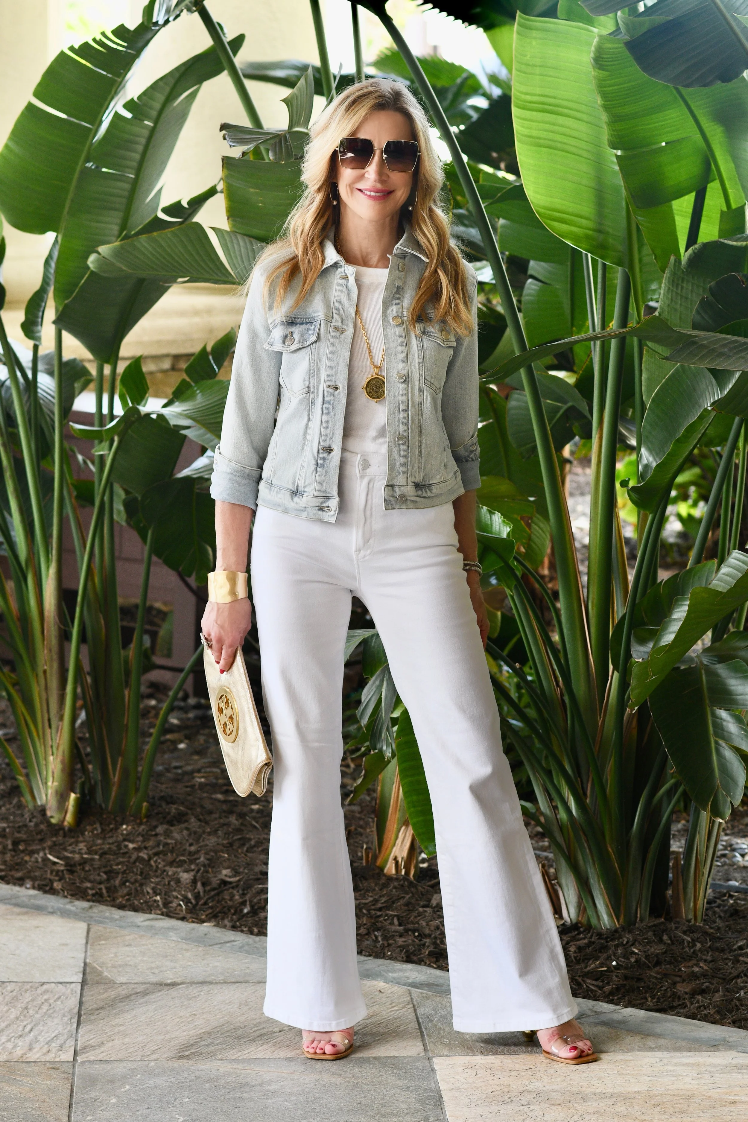In my opinion, you can never have too many denim jackets! They are great for transitional seasons and such a stylish layer to wear with jeans, dresses and everything in-between! The denim jacket Iβm wearing here is a fitted, iight wash and really compliments the white jeans and gold accessories! You really canβt go wrong with a solid column of color (white, black or any color) and itβs an easy outfit formula that works every time! These jeans are right on trend and Iβll be reaching for them often as the weather gets warmer!