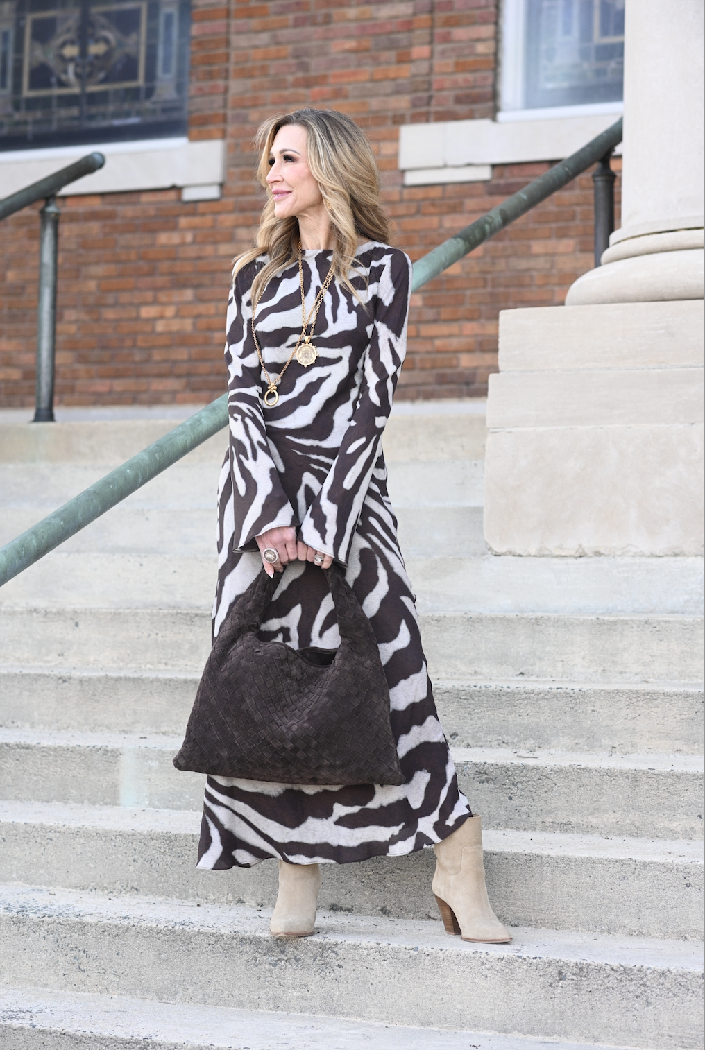 I styled the dress with taupe booties from Brochu Walker, my brown suede handbag (similar linked below) and fabulous jewelry from Julie Vos. I’m obsessed with the new Julie Vos collection and have been wearing these pieces with everything!