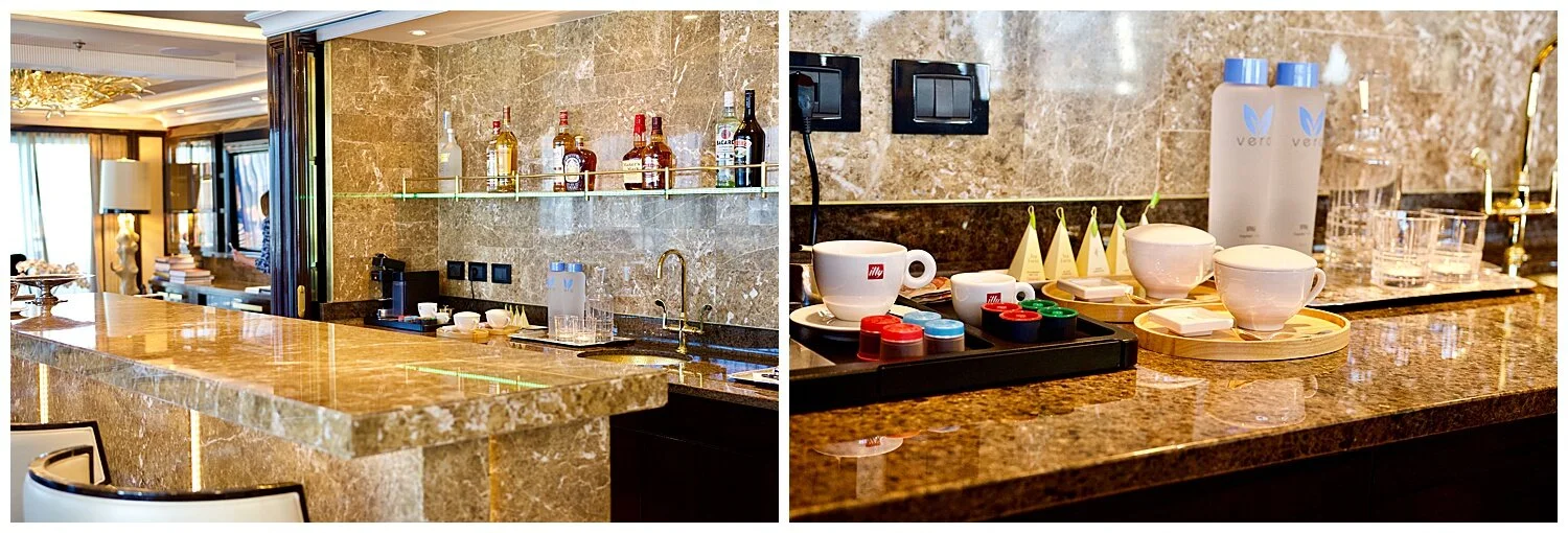 The suite pictured includes a spa where you can receive services such as massages and facials. The staff takes care that your suite is stocked with all the things you love from your favorite liquor to your favorite coffee and snacks.