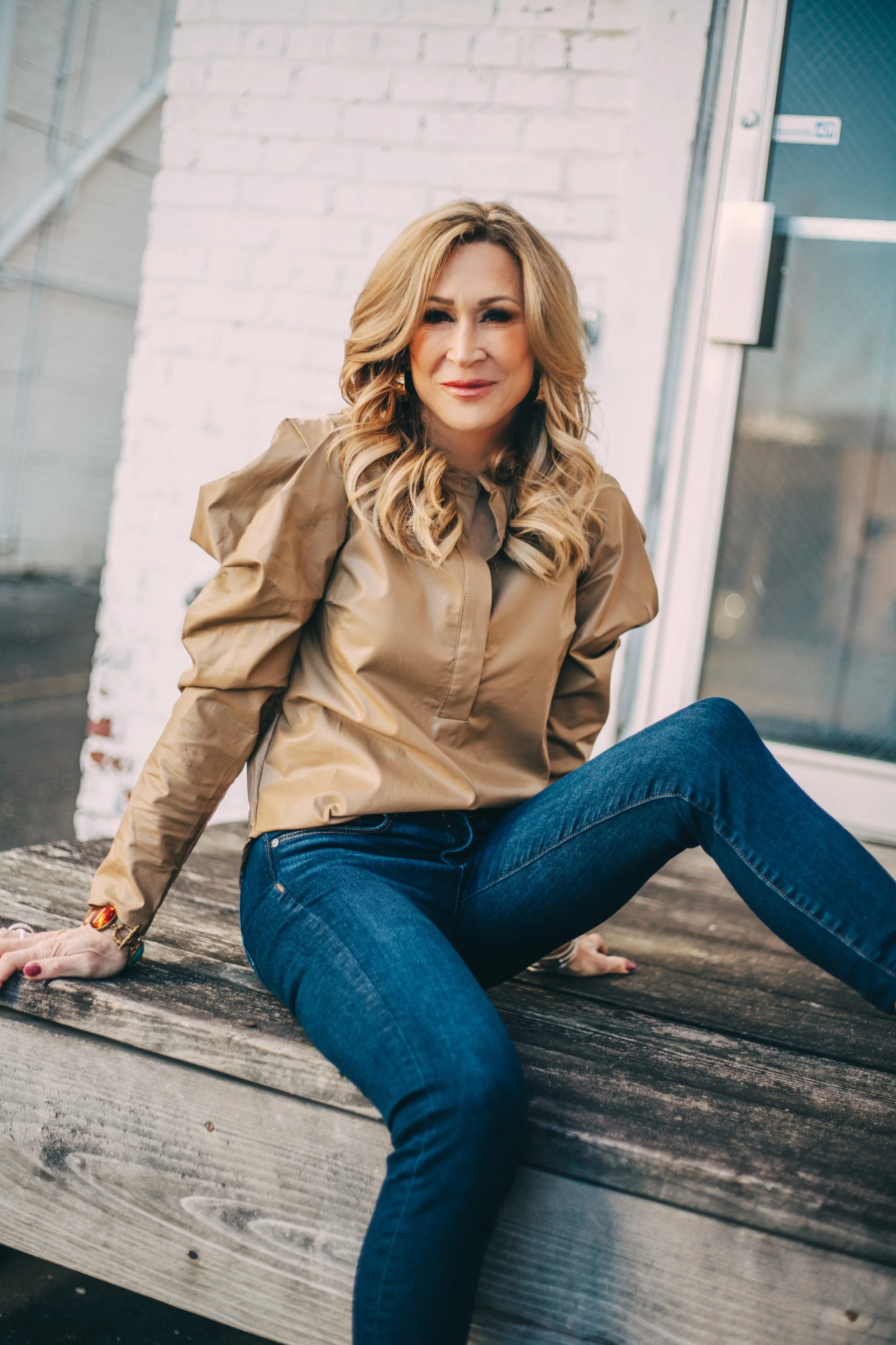 A good friend of mine opened a local boutique and I get into trouble on the regular because it’s hard to resist the cute things in her shop! I found this amazing faux leather top there the other day and I’m kind of obsessed! I couldn’t find the exact top, but I’ve linked similar as well as the jeans and my fabulous Veronica Beard fringe booties (they also come in black)!