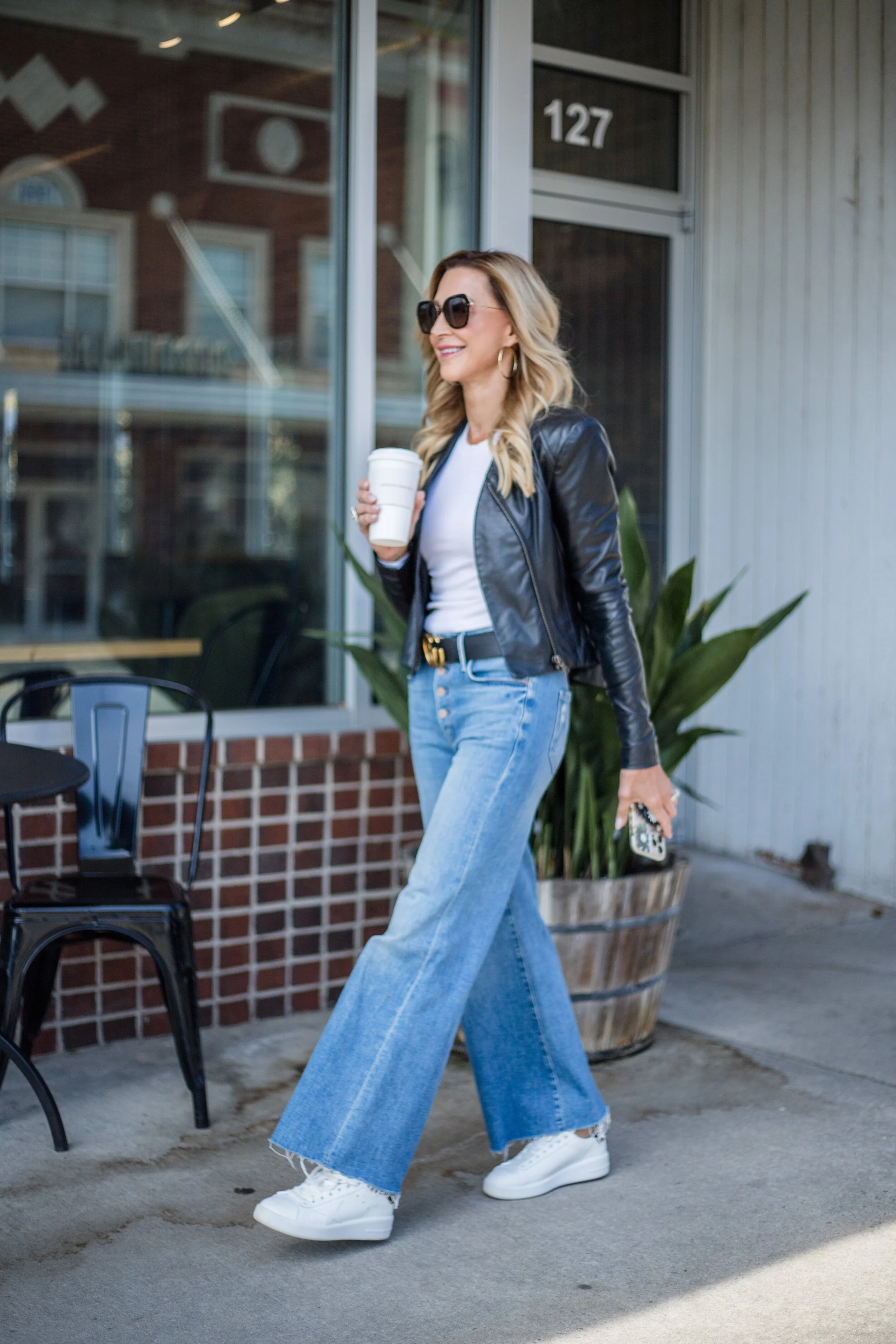 Absolutely loving this easy fall look with sneakers and wide leg jeans!