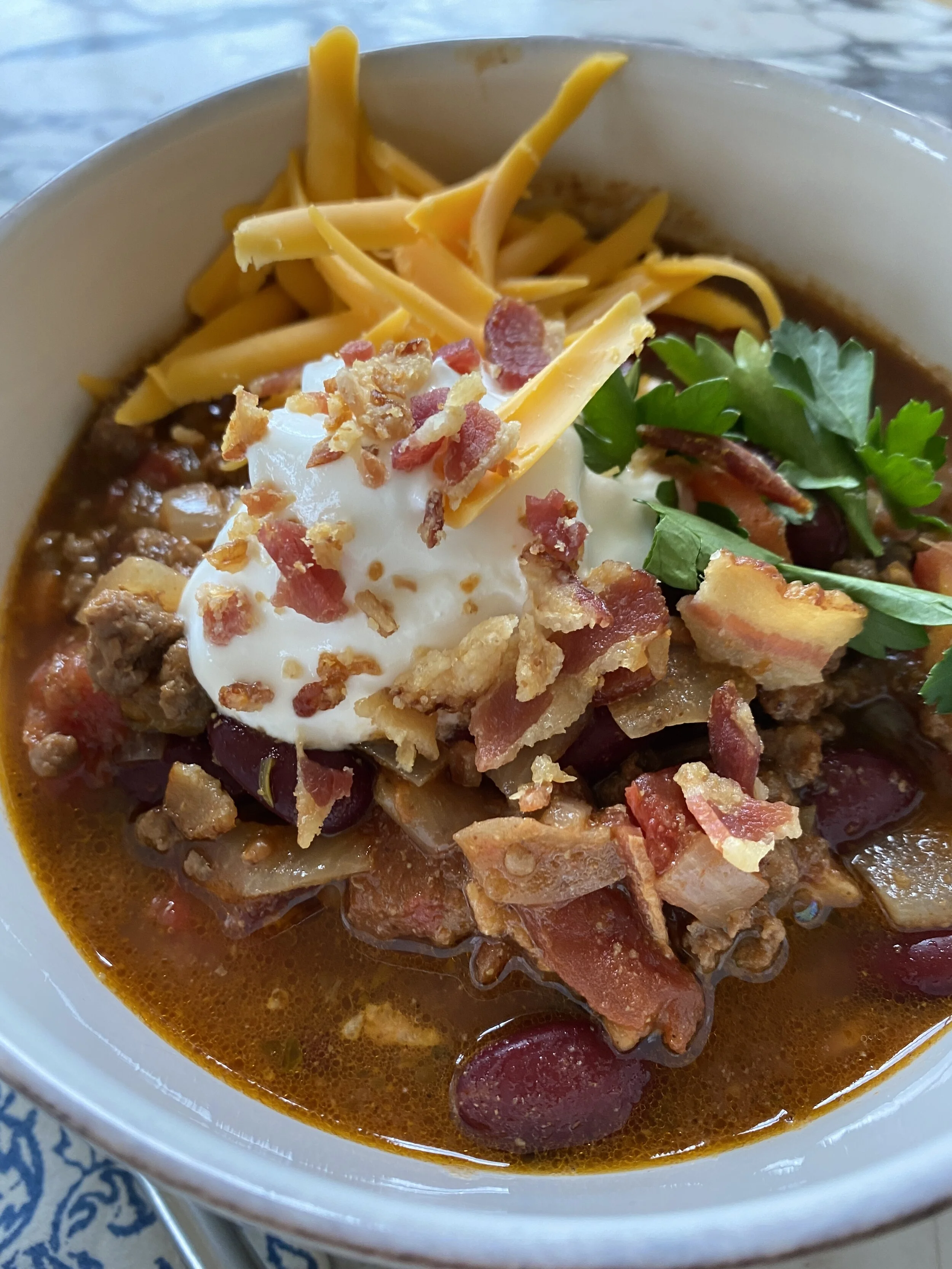 I went to the grocery store yesterday and got what I could. As you all know…that’s the only way to shop at this moment. I had the ingredients to make chili, so I made a big pot that should last us a couple of days. Here is the recipe…yes it has bacon! I hope you enjoy!