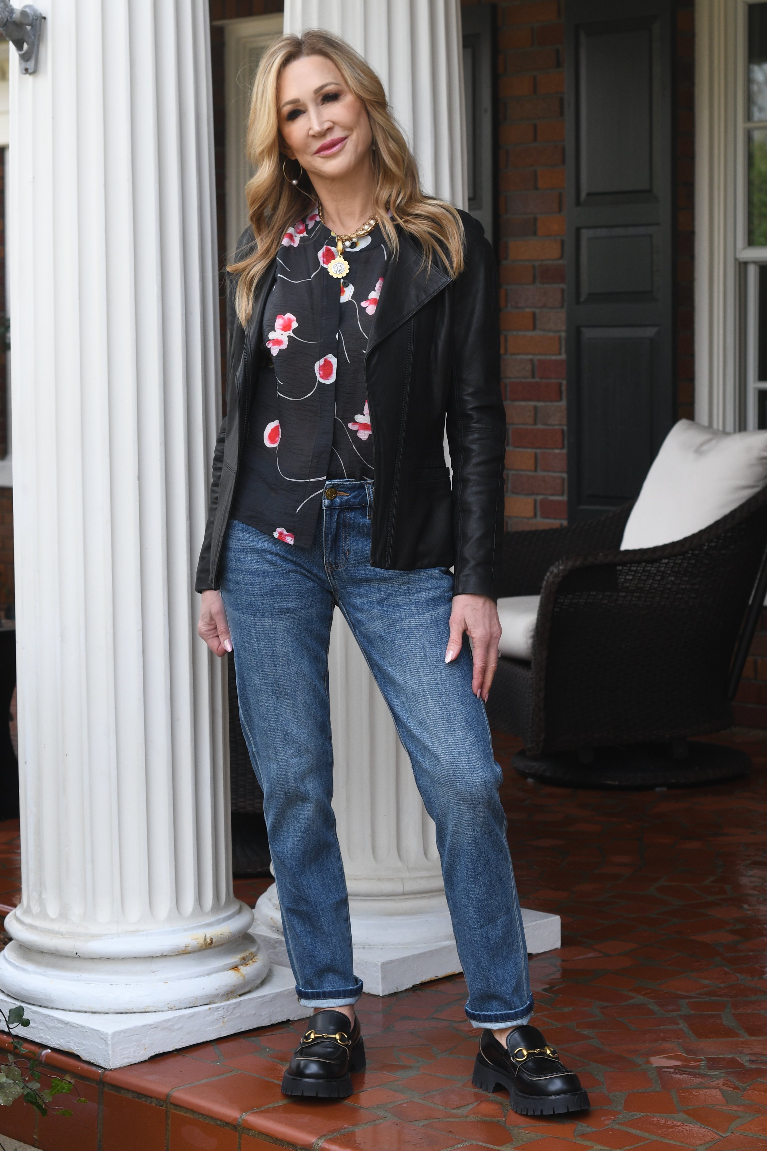 I’ve really and kind of unexpectedly embraced the menswear look for the past several seasons and adding a floral pop makes this look even more interesting! I’ve been telling y’all that low waisted jeans are coming back and here’s the proof! These cute boyfriend style jeans from Cabi are low waisted and have a looser fit so they’re perfect for creating a menswear look! The floral blouse and a buttery soft leather jacket along with lug sole loafers complete the look! I also added pearls to add even more interest! What do you think?