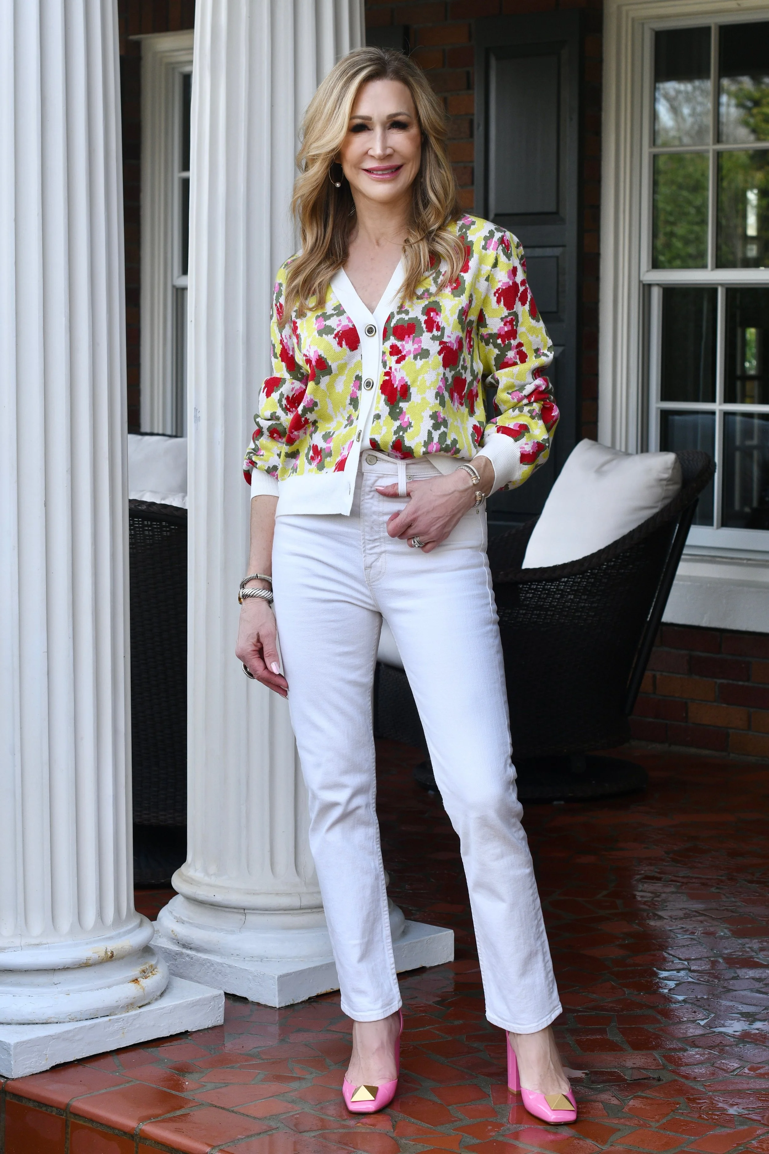 You may think that pink patten leather shoes wouldn’t be very versatile, but I’ve been surprised at just how much I have in my closet that looks good with these pink pumps! The Cabi floral sweater and white jeans are so perfect with the shoes and it’s a Miranda Priestly approved look!