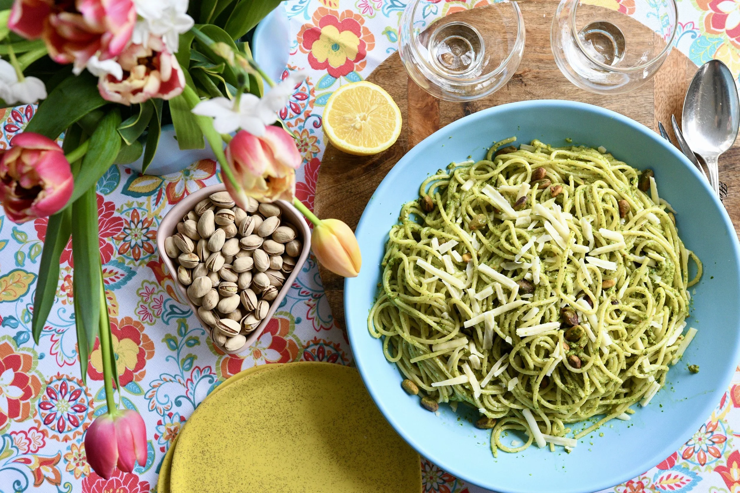 Springtime Pasta - Spaghetti with Arugula & Pistachio Pesto