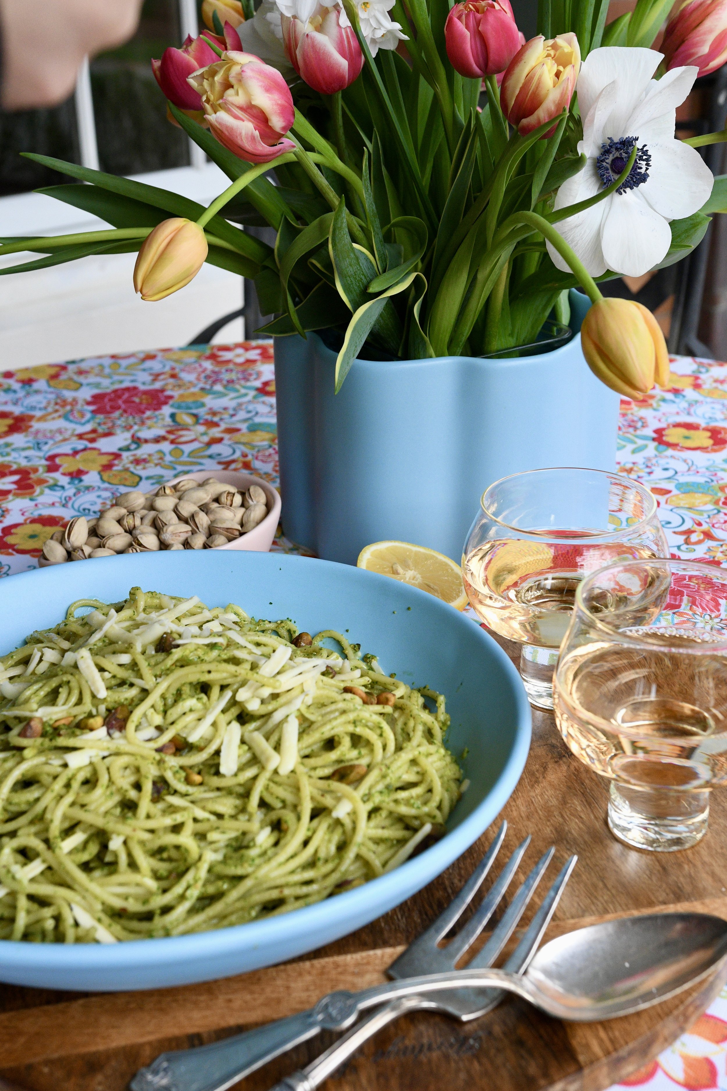 Creating beautiful table settings has become a passion for me and this one really made me happy! The tablecloth is one that I’ve had forever and was purchased at TJ Maxx! For some reason, I’ve held on to it and I’m so glad that I did because it really brought the elements of this table together. The blue serving bowl, flower vase and green plates are from Haand Pottery and so perfect for spring! I love the green pesto with the blue bowl! I really couldn’t believe how perfect the colors were! The flowers came from a local farm called Rodwell Roots and are the pink tulips truly some of the most beautiful tulips I’ve ever seen!