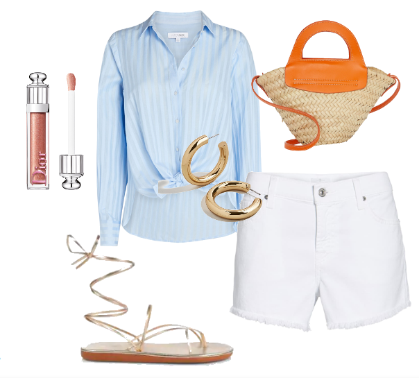 INTERMIX Gretchen Striped Button-Down Shirt // HEREU Cabas Straw Tote Bag // 7 For All Mankind® Cutoff Denim Shorts // BaubleBar Dalilah Medium Tube Hoop Earrings // Dior Addict Stellar Gloss // Ancient Greek Sandals - Wraparound Ankle